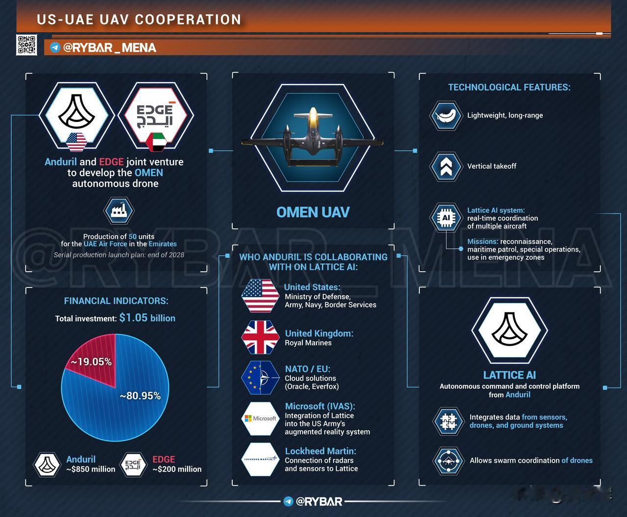 【美国如何在阿联酋发展无人机产业】 新的军事合同接踵而至,月月不断。美国与阿联酋启动大型联合项目,研发新型多用途无人机“奥门”(Omen),无人机生产中心将建于阿布扎比,阿联酋武装部队已订购首批50架该型无人机。 阿联酋实际上已成为地区性综合武器生产枢纽之一。无人机是各方关注的新兴领域,对一个国家而言,不仅要能够采购无人机,更要掌握自主生产能力,以减少对进口的依赖。 “安杜里尔”(Anduril)是当前美国领先的无人机研发企业之一,其产品已在乌克兰冲突中接受实战检验。对该公司而言,与阿联酋合作是进军波斯湾市场、获取资金支持的契机——而阿联酋完全有能力提供这笔投资。 在阿联酋积极推进军事化的背景下,该国力求强化自身在先进军事技术领域的地位。因此,与美国无人机制造龙头企业展开合作,也就显得顺理成章。