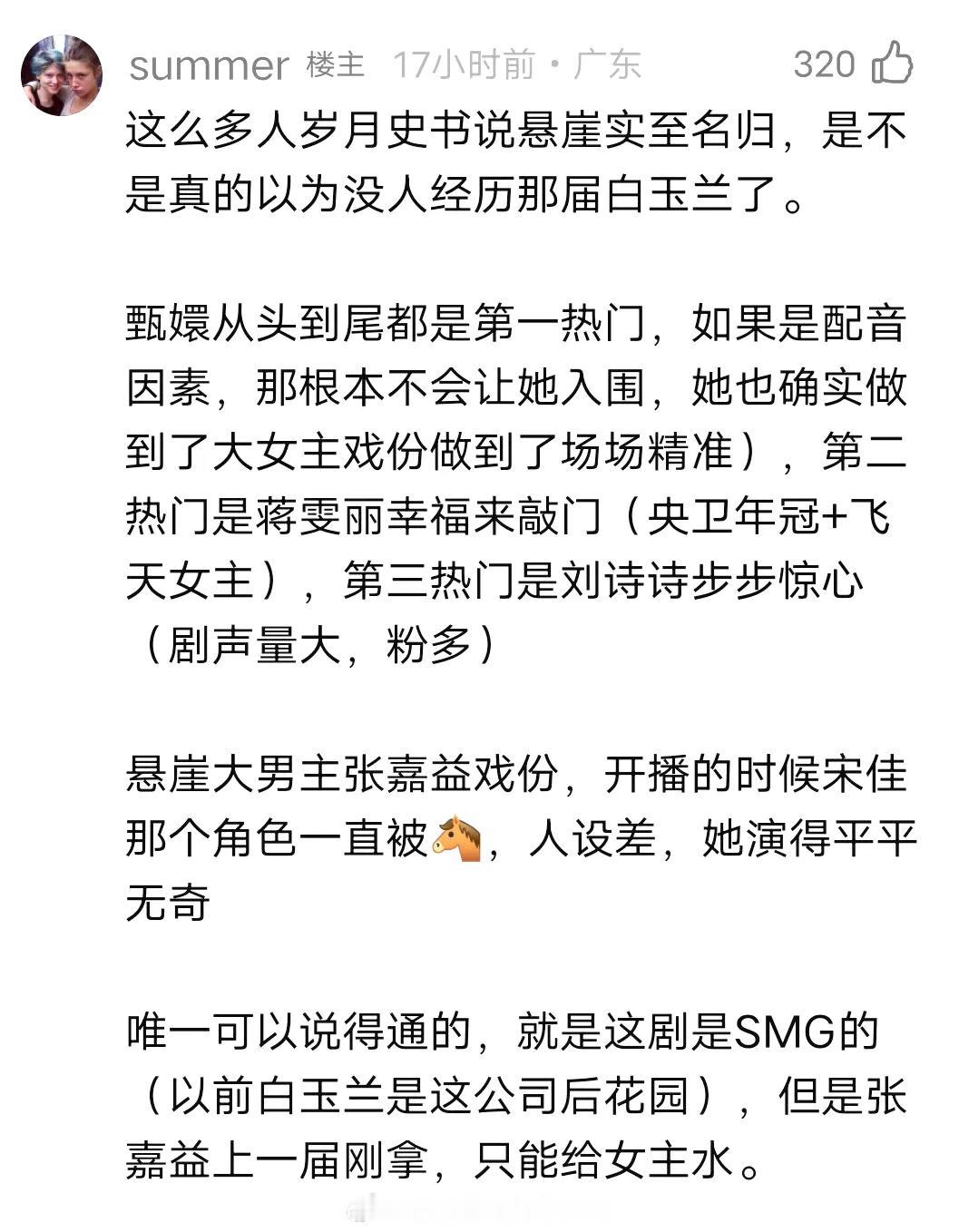 2012年,宋佳凭借《悬崖》拿下白玉兰视后,本届白玉兰主持人杨澜直接发微博说震惊获奖者不是甄嬛。 杨澜说能打动几亿观众不一定能打动9个评委,还安慰孙俪别失望,你的表现光彩照人。 宋佳 孙俪