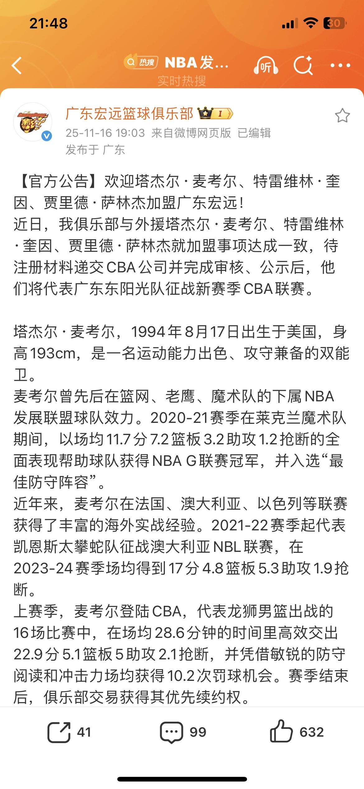 广东宏远官宣三外援正式加入。 欢迎塔杰尔·麦考尔、特雷维林·奎因、贾里德·萨林杰加盟广东宏远! 广东三个外援都确定了,相信第四个也不会太远了,一起期待好事将要发生! 麦考尔和萨林杰都在CBA征战过,都已经证明他们的水平是相当厉害,奎因也是被朱总考察了两年的外援,相信也不会太差,我们一起期待宏远新的赛季要起飞了……
