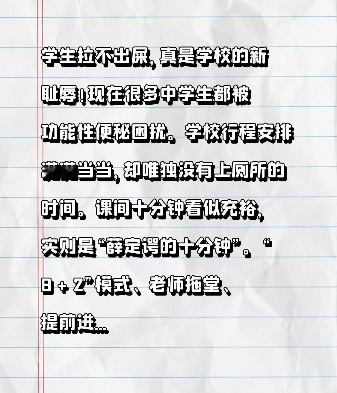学生拉不出屎,真是学校的新耻辱!现在很多中学生都被功能性便秘困扰。学校行程安排满满当当,却唯独没有上厕所的时间。 课间十分钟看似充裕,实则是“薛定谔的十分钟”。“8 + 2”模式、老师拖堂、提前进教室等,让学生上厕所时间大幅压缩。有高二学生回家蹲一小时都难拉出。 上海一项调查显示,4969名学生中,功能性便秘患病率达13.95%,还有医生接诊过10名超一个月不排便的学生。学校把学生当“高效零件”,却忽视了基本生理需求,这样的教育真的太没人性温度了。 排便误区