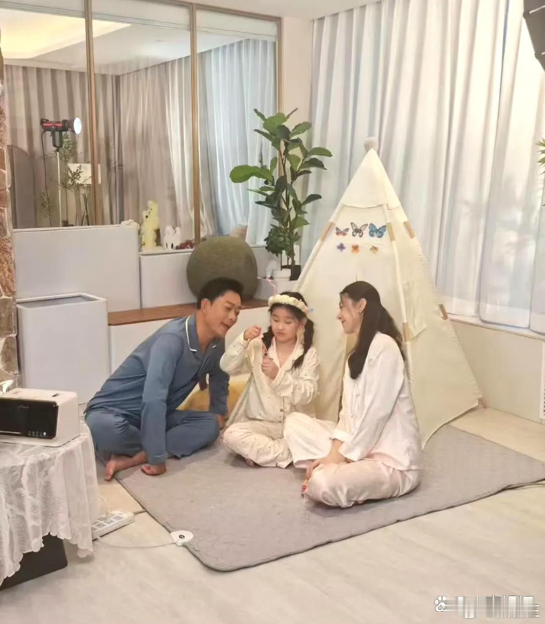 52岁黄海冰和老婆女儿一起在客厅开睡衣派对,一家人感情和睦。女儿扎着麻花辫,长相灵动可爱,颜值挺高的。