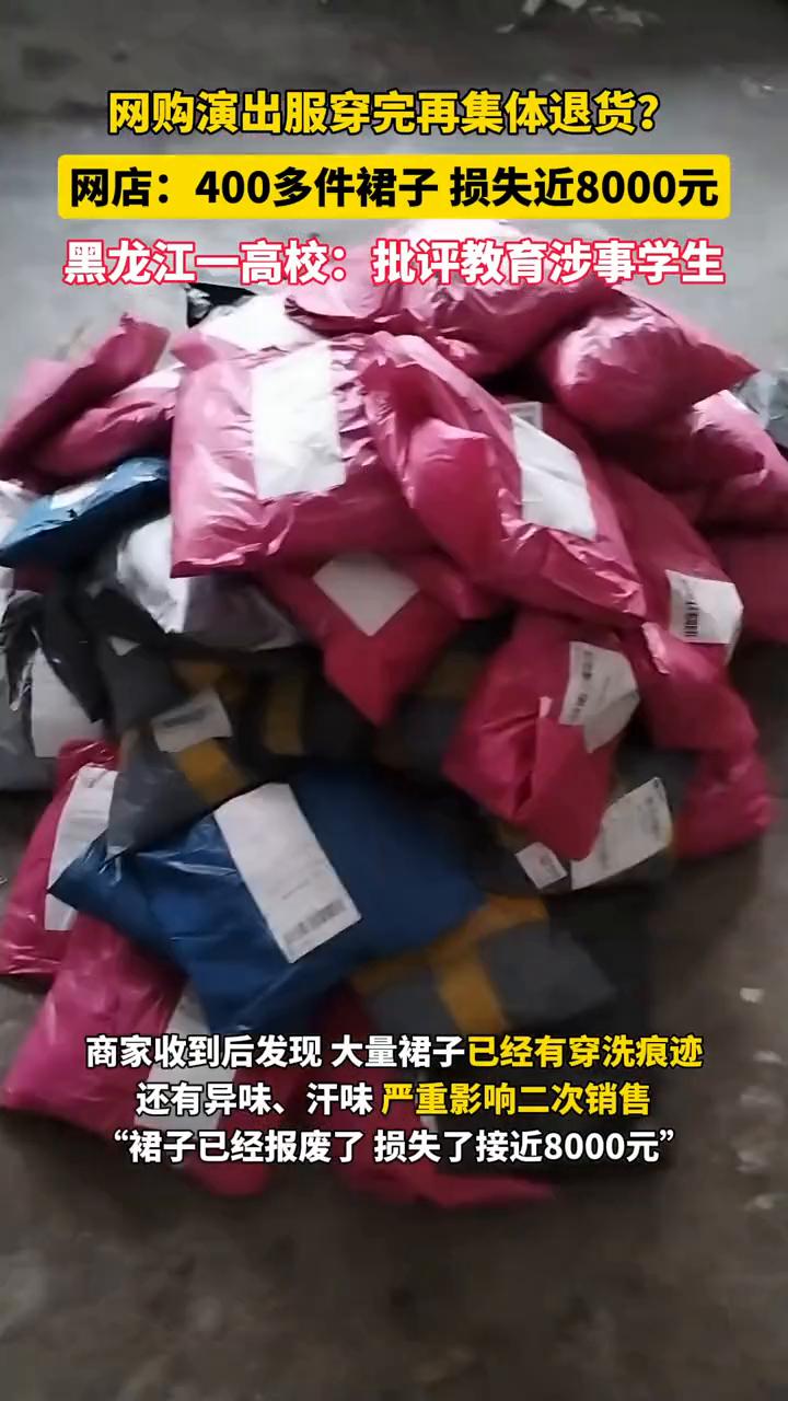 网购演出服穿完再集体退货?网店:400多件裙子损失近8000元。黑龙江一高校:批评教育涉事学生。 6月10日浙江金华一网店负责人称,黑龙江幼儿师范高等专科学校多名学生网购他家店铺服装穿过之后集体申请退货退款。商家收到后发现大量裙子已经有穿洗痕迹,还有异味、汗味,严重影响二次销售。"裙子已经报废了,损失了接近8000元"。 6月11日涉事学校发布情况通报:学校已对涉事学生批评教育,并安排专人与商家表达歉意,商议解决措施。