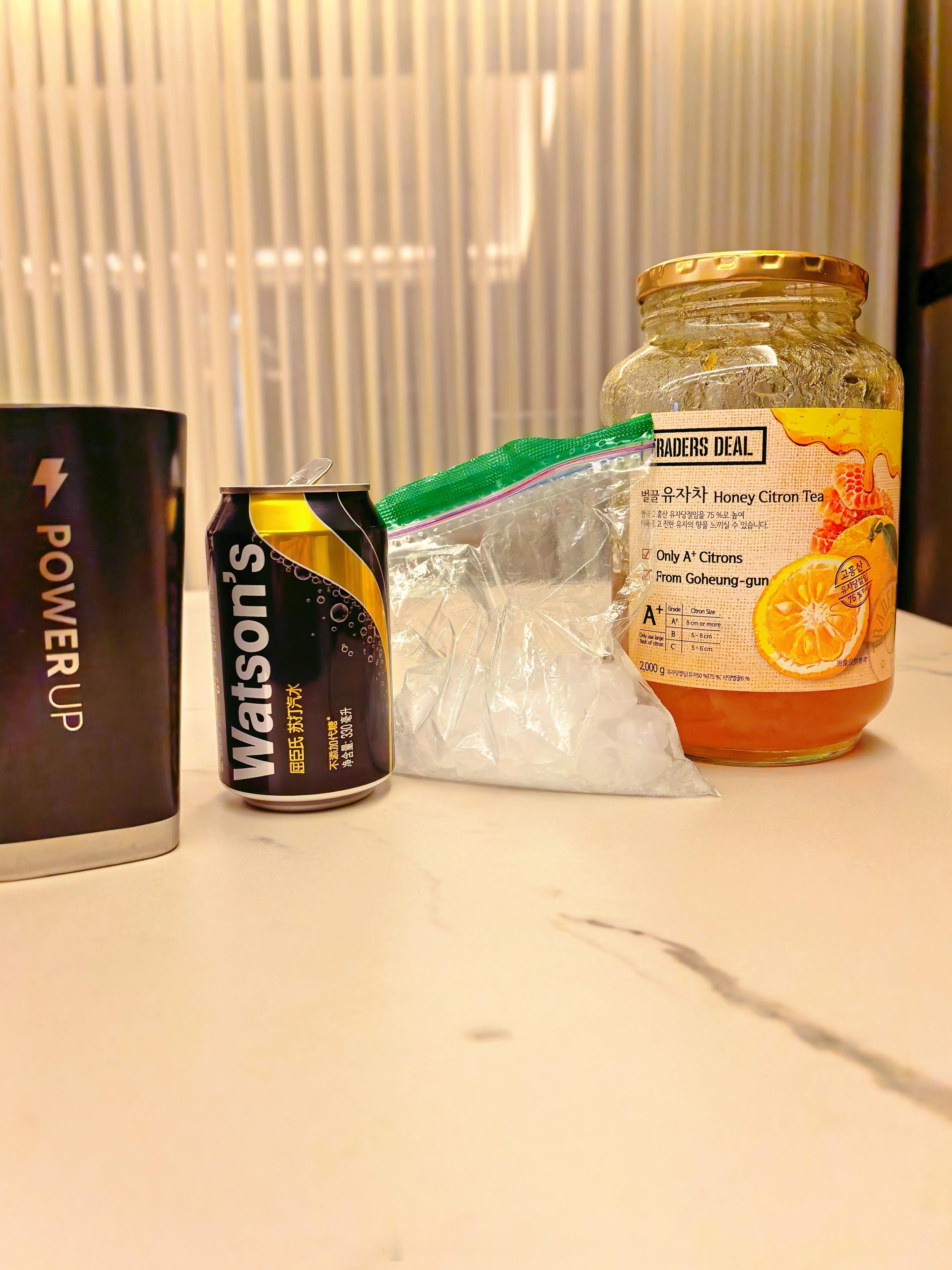 试试这么配,气泡水+冰+金桔柠檬!