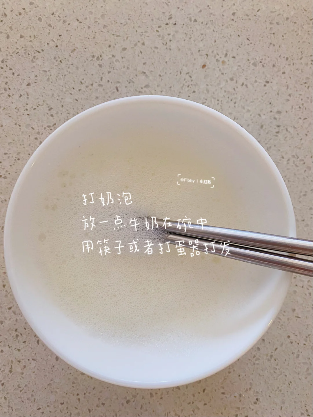 4️⃣打奶泡🥛放一点牛奶在碗中🥣然后用筷子🥢或者打蛋器不断打发它(比想象中快很多,打的时候可以把打发的部分先放入一个碗,然后继续打剩下的,以此反复多次。一次性打完所有非常难❗️)无需奶泡机喔❗️