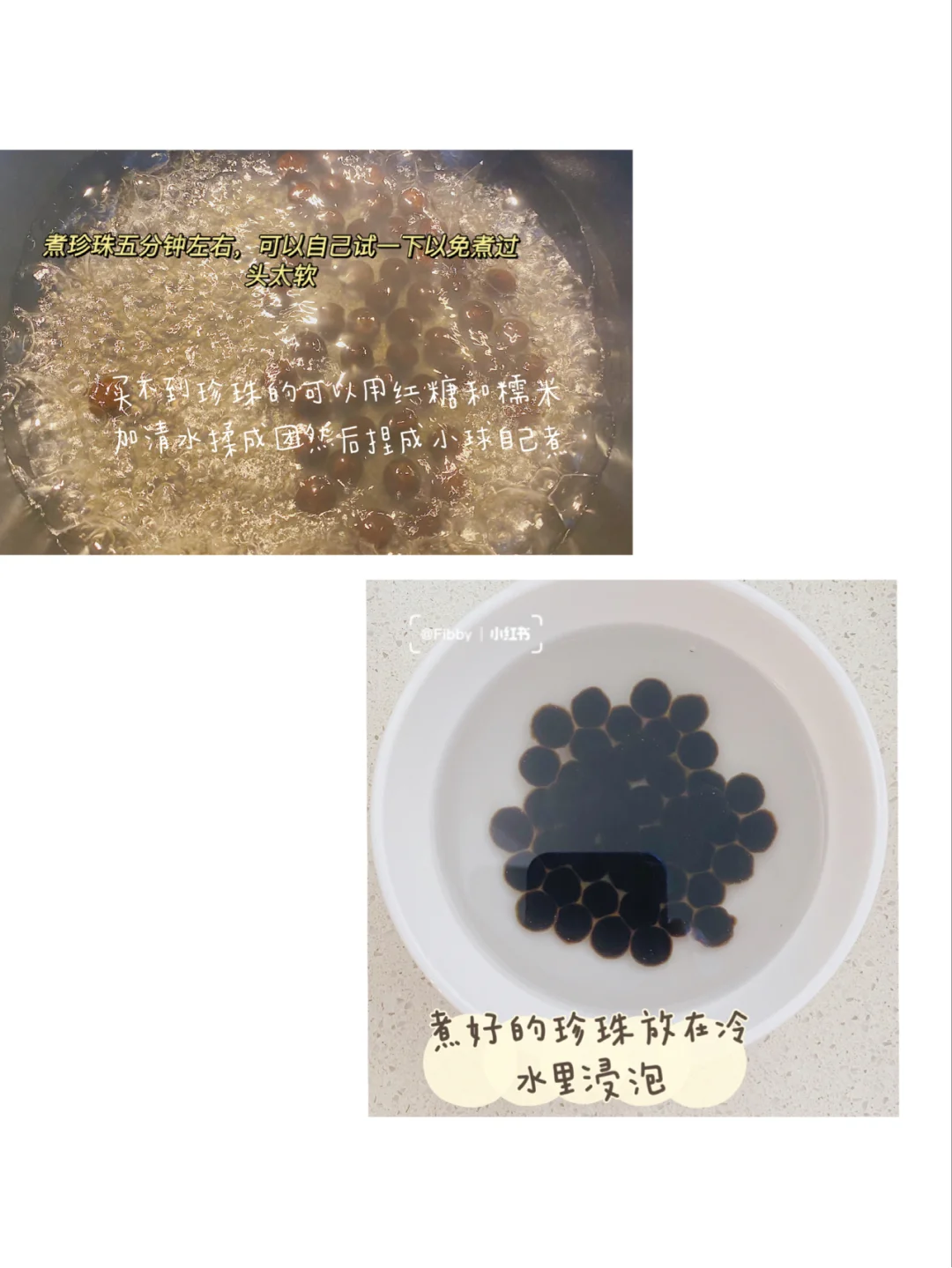 1️⃣煮适量的珍珠五分钟左右,然后放进冷水里浸泡以免粘连在一起