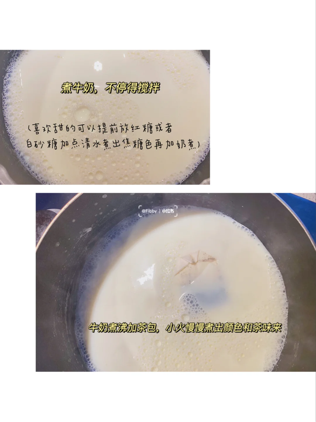 1️⃣喜欢喝甜奶茶的小伙伴记得要在第一步前先放糖,然后放一点清水让它煮到变焦糖色再放奶喔(但是会很大程度增加热量,且我个人觉得不放糖也是甜的[笑哭R][笑哭R])