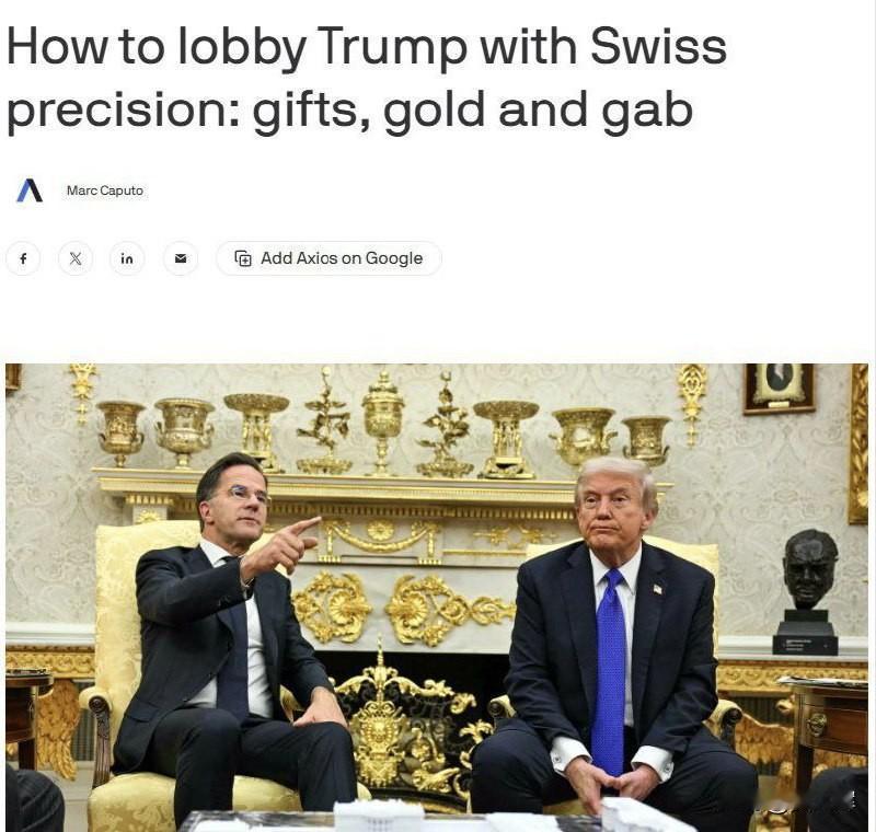 Axios:瑞士通过用奢华礼物“讨好”特朗普,成功降低了美国关税 该媒体报道称,一个瑞士商界领袖代表团带着昂贵的礼物抵达白宫,其中包括一块价值13万美元的定制金条和一块劳力士腕表。这些商界人士还对特朗普极尽奉承,并承诺向美国投资。 Axios指出,以喜爱黄金、奢侈品和商业大亨而闻名的特朗普,对这一姿态表示了热情的回应。结果,几天后,美国便将对瑞士商品的关税从39%下调至15%。