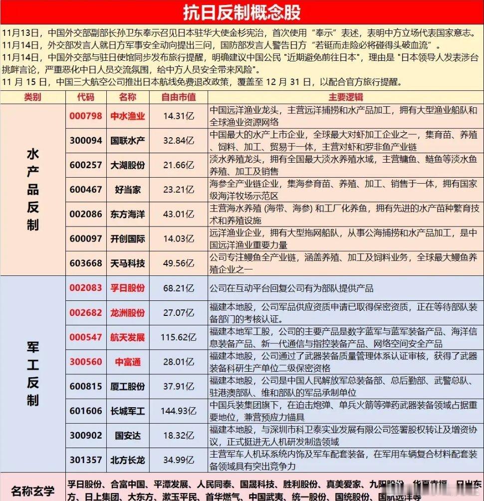 锂电+添加剂六氟磷酸锂辨识度:天际股份、多氟多、天赐材料VC电解液辨识度:孚日股份、华盛锂电、永太科技EC溶剂辨识度:海科新源、石大胜华、奥克股份隔膜辨识度:恩捷股份、佛塑科技、星源材质反制日本概念水产辨识度:国联水产、中水渔业、百洋股份军工辨识度:晨曦航空、江龙船艇、中g海防名字辨识度:鲁抗医药、日出东方、大东方寒潮+流感药品辨识度:特一药业、众生药业、亨迪药业疫苗辨识度:金迪克、华兰疫苗、百克生物煤炭辨识度:安泰集团、大有能源、郑州煤电天然气辨识度:长春燃气、首华燃气、胜利股份服装辨识度:古麒绒材、新澳股份、华英农业