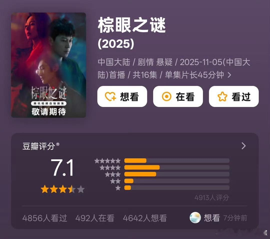 秦俊杰 汪铎 黄梦莹《棕眼之谜》豆瓣开分7.1,四千多人打分