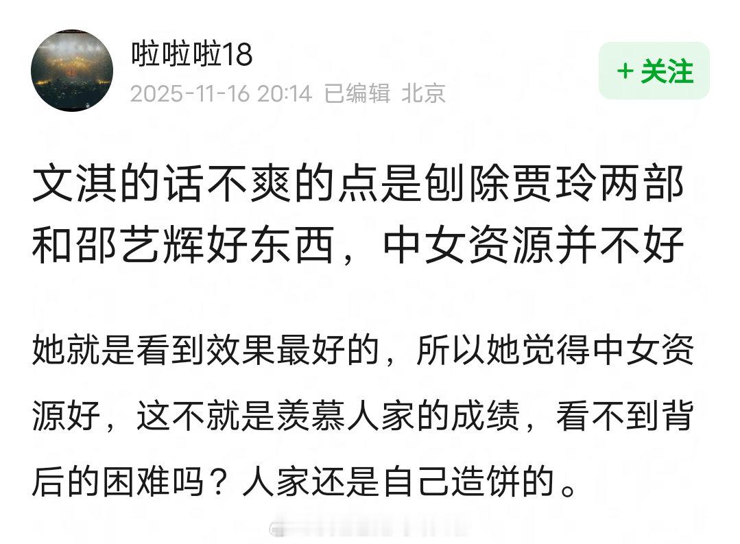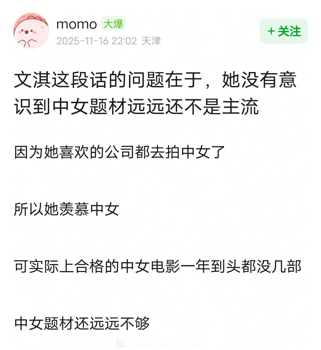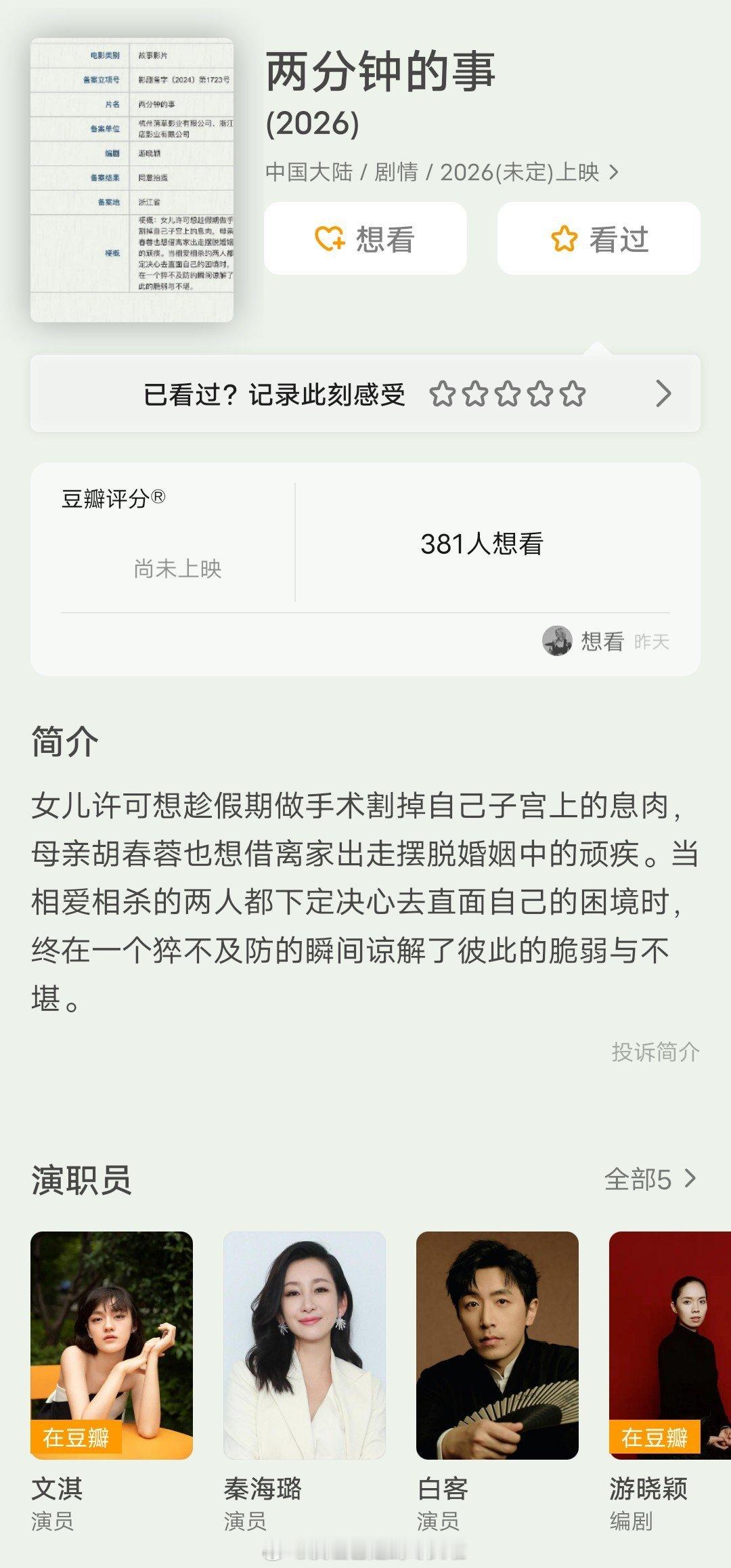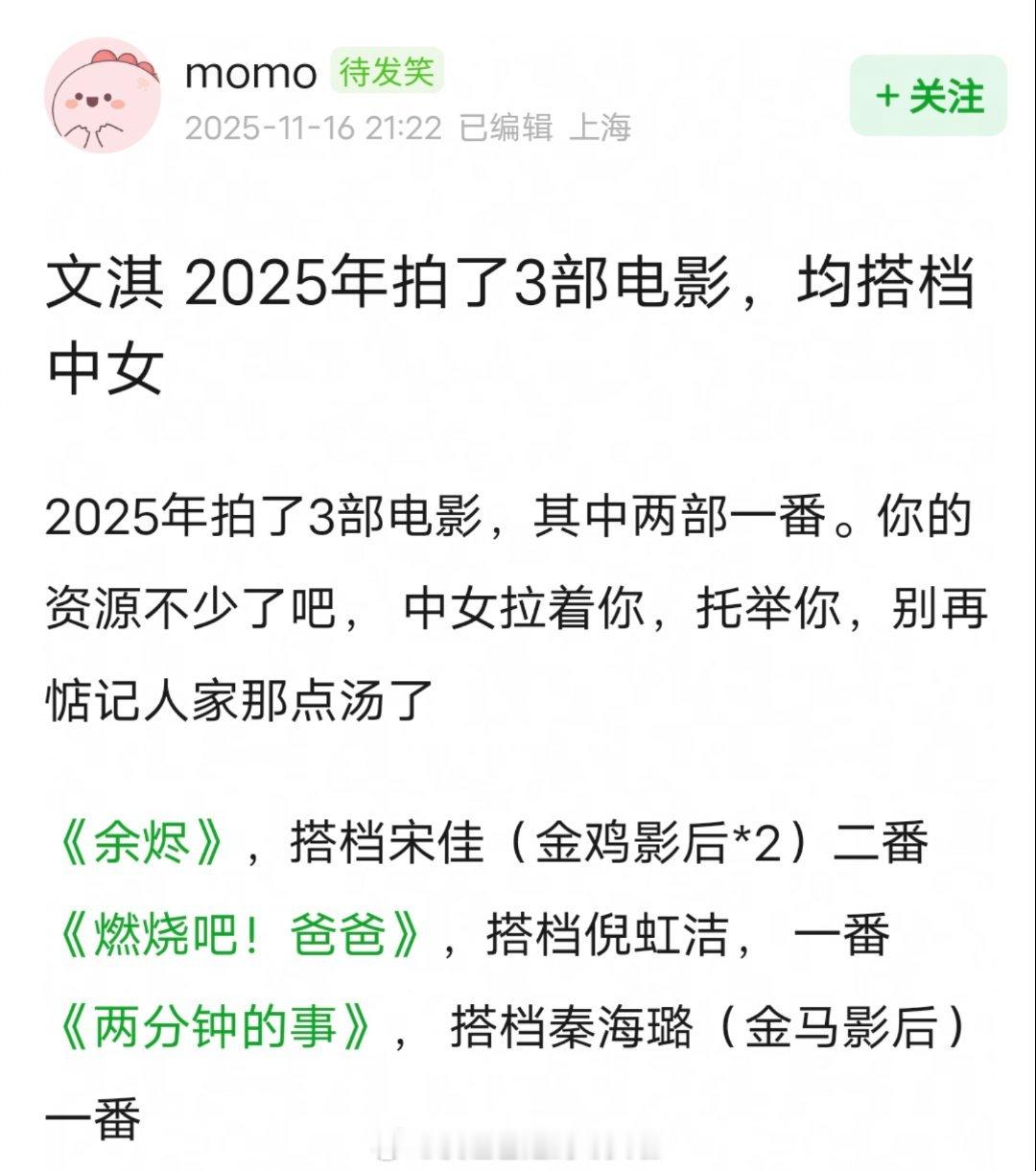 文淇2025年拍了3部电影,均搭档中女《余烬》,搭档金鸡影后宋佳 二番《燃烧吧!爸爸》,搭档倪虹洁, 一番《两分钟的事》, 搭档金马影后秦海璐,一番