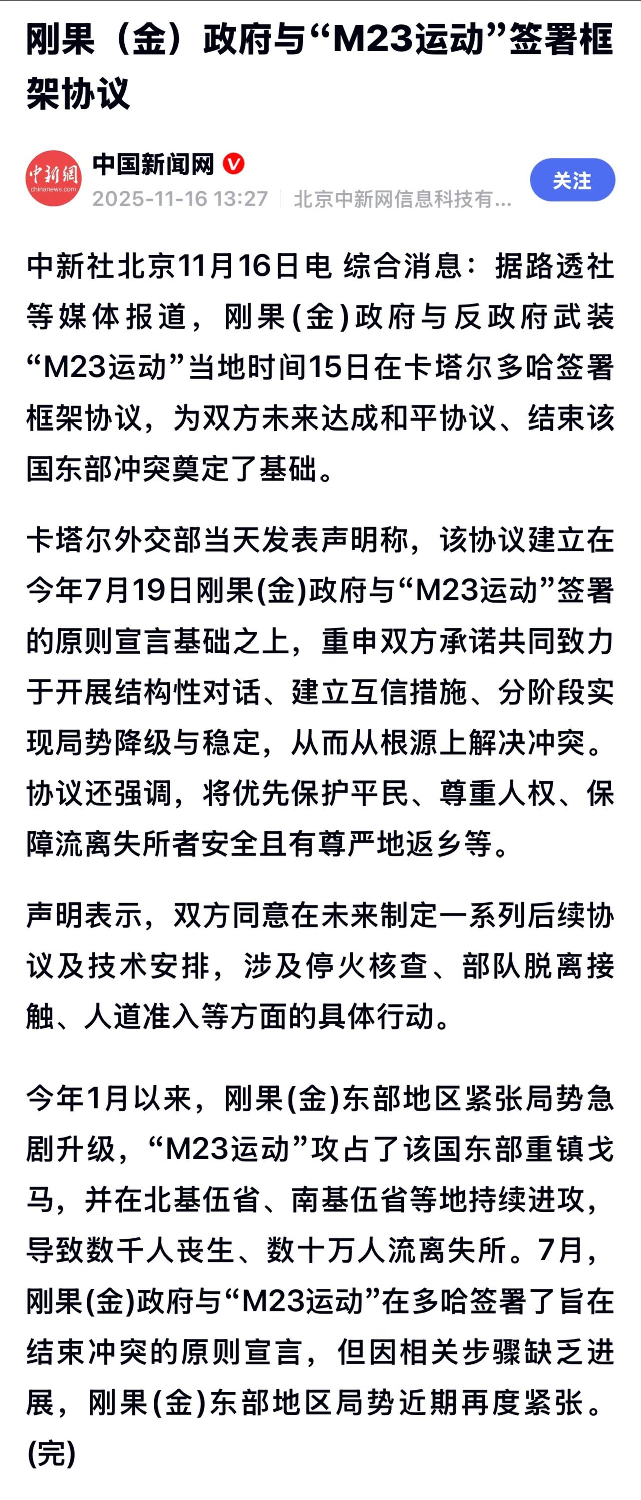 今年6月,中非国家卢旺达与刚果(金)在美国政府和卡塔尔的幹旋下签署和平协议,承诺结束长达30年的冲突。