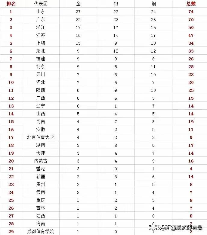 全运会奖牌榜,广西反超辽宁,山西,广东夺回榜首仅是时间问题。 第十五届全运会奖牌榜截至目前,广东代表团获取总数70枚(金,银,铜)排名第二,而山东代表团目前74枚奖牌暂时排在奖牌榜第一位,其中广东男,女篮已经贡献6枚金牌,目前单项目篮球U18和U22冲击金牌的概率非常大,所以,目前山东代表团排名第一并不稳固,广东反超山东夺回榜首仅是时间问题。 意外的是作为体育强省辽宁代表团目前仅收获14枚奖牌和山西代表团并列13位和14位,则广西代表团却以15枚奖牌反超辽宁,山西确实令人意外。 辽宁代表团篮球项目几乎全军覆没,目前没有收获任何一枚奖牌,仅剩下的U22男篮冲击奖牌的概率不大,毕竟辽宁U22男篮仅8人出战能冲进8强已算奇迹了。