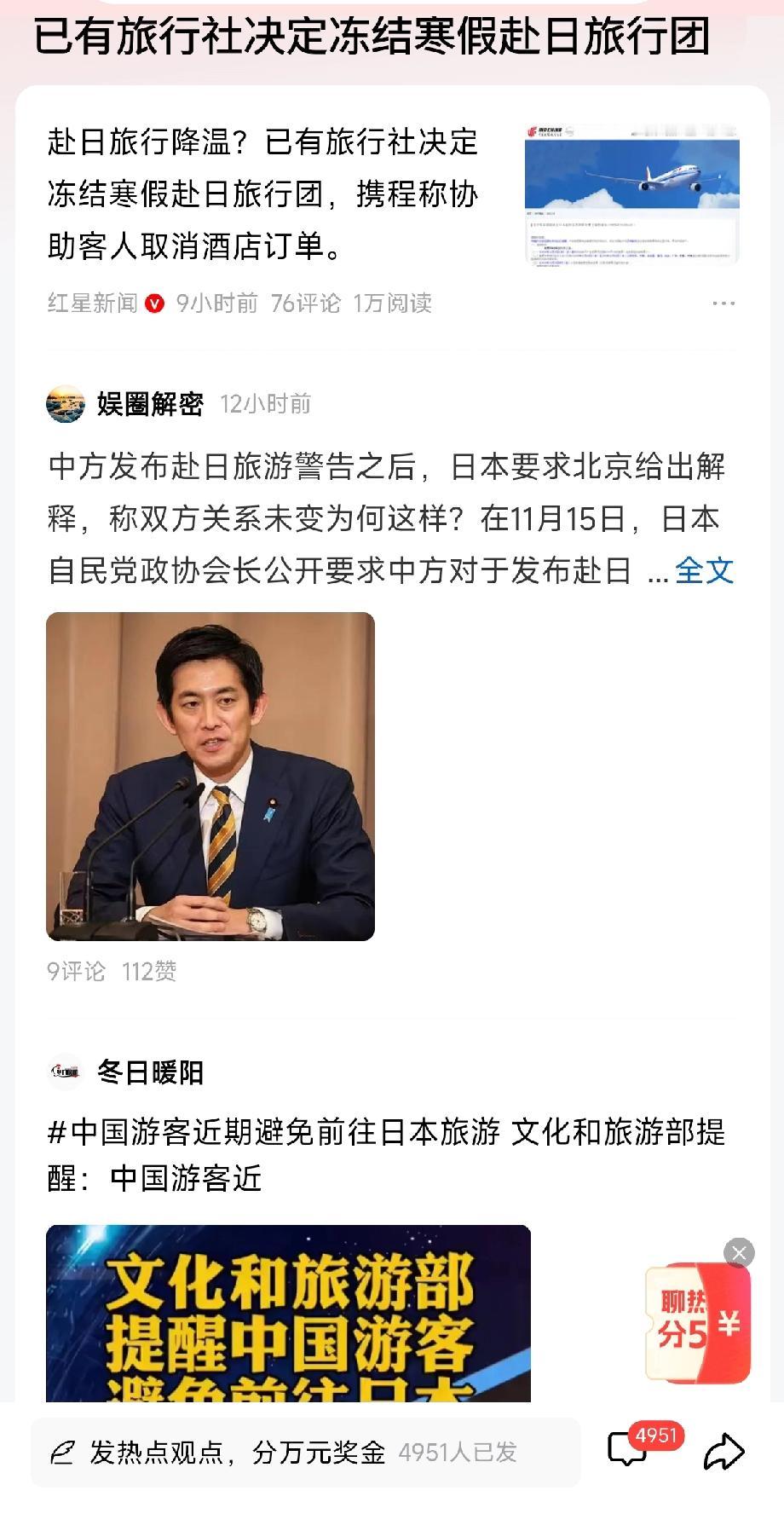 突发!多家旅行社冻结寒假赴日团,三大信号刷屏,这波操作太硬气! 刚预热的寒假赴日游突然“急刹车”!继外交部、文旅部接连发布赴日旅游风险提醒后,北京、上海等多地旅行社已果断出手——冻结寒假赴日旅行团收客,尚未签约收定金的远期团直接暂停,近期团也启动退改应急机制 。这波迅速响应的背后,藏着三个让人拍手称快的关键信号! 信号一:安全永远是底线,国家提醒必须听!此次冻结绝非偶然,核心原因是日本方面近期在台湾问题上发表露骨挑衅言论,严重破坏人员交流氛围,给在日中国公民人身安全带来潜在风险。文旅部明确提醒“近期避免前往”,国航、南航等航司同步开放12月31日前日本航线免费退改,从官方到企业形成闭环防护,这是对同胞安全最实在的守护! 信号二:市场用脚投票,挑衅就得付代价!要知道,中国游客可是日本旅游业的“顶梁柱”——2025年上半年大陆游客在日消费超5100亿日元,撑起外国游客总消费的三成,东京银座药妆店、京都民宿、北海道滑雪场全靠中国游客撑场。如今旅行社冻结收客、自由行团因退订太多直接解散,日本机票预定量暴跌六成,冲绳民宿取消率超四成,曾经喊着“景点要清净”的日本网友,怕是没料到自家商家会急得跳脚。 信号三:祖国山河处处好,何必远赴他乡找风险!一边是赴日游的不确定性,一边是国内游的火热选项——张家界的奇峰、九寨沟的海子、东北的滑雪胜地,不仅安全放心,服务更贴心。不少旅行社同步推出“赴日团转国内游”福利,无损退改还送专属优惠,既响应了国家号召,也给游客多了暖心选择。 国家的提醒从不是“限制”,而是“保护”;旅行社的冻结不是“跟风”,而是“担当”。在安全面前,所有旅程都该让道;在底线问题上,我们从不含糊!你怎么看这波寒假赴日团冻结?欢迎在评论区聊聊~