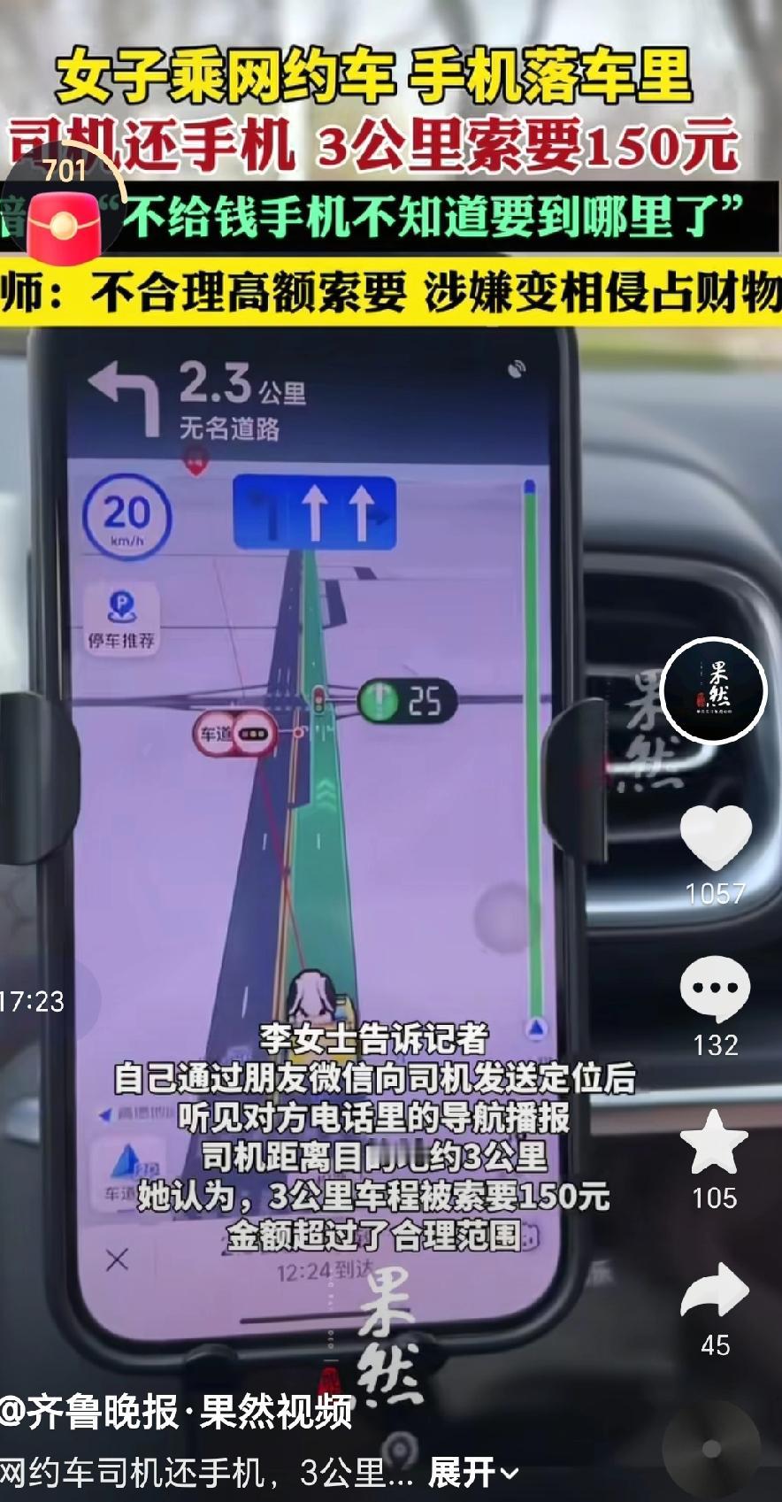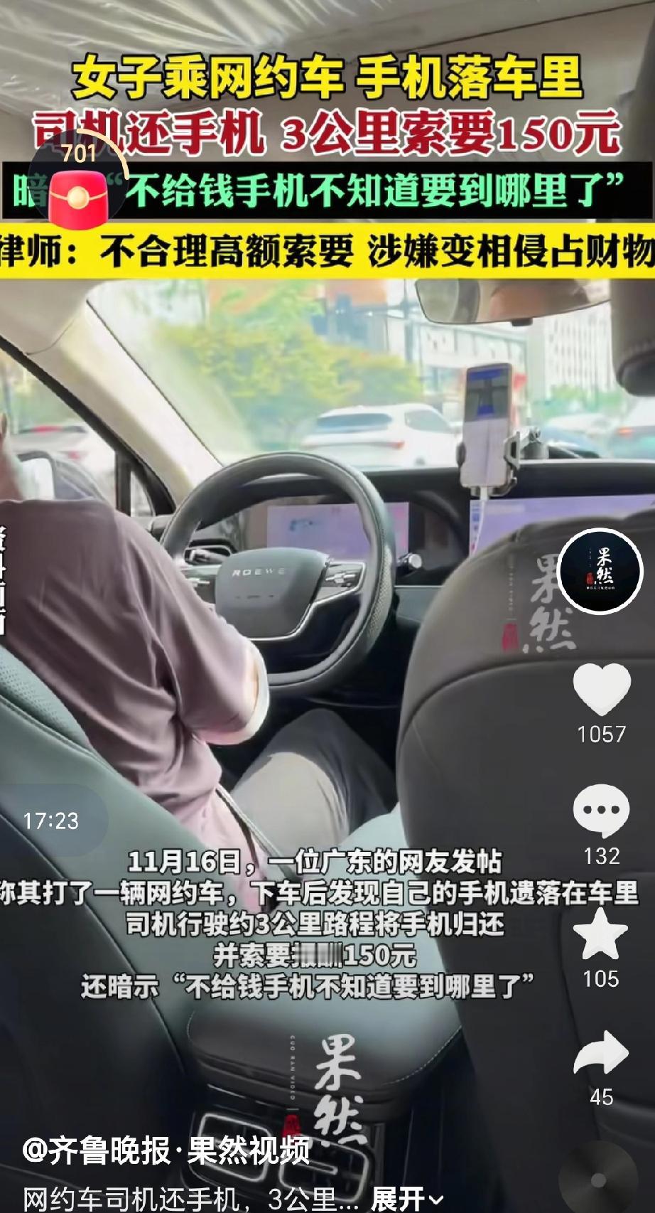 11月16日,一位广东的李女士乘网约车时将手机落在车内,司机行驶约3公里路程送还手机,却索要150元,还暗示“不给钱手机不知道要到哪里了”。李女士认为3公里路程被索要150元金额过高。律师表示,该司机索要的费用明显高于实际必要支出(如油费、时间成本等),属于不合理高额索要,涉嫌变相侵占乘客财物。(来源于@齐鲁晚报·果然视频)