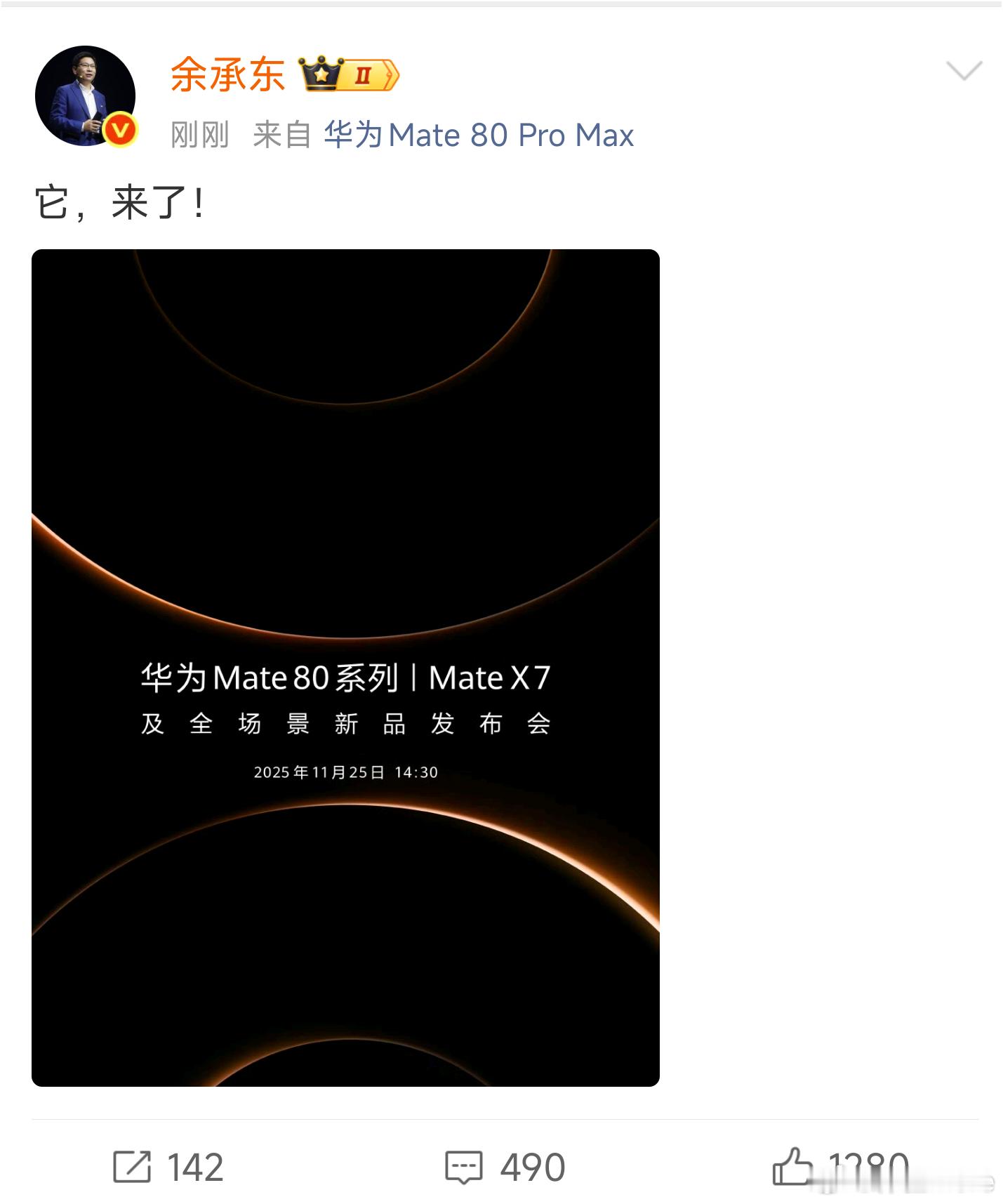 华为Mate 80系列 | Mate X7发布会官宣。Mate 80系列采用双环设计。共有华为Mate 80、Mate 80 Pro、Mate 80 Pro Max、Mate 80 RS 非凡大师、华为Mate X7、Mate X7典藏版等几款新品。看点:新国产芯麒麟9030、20GB+1TB、48MP和50MP双潜望。
