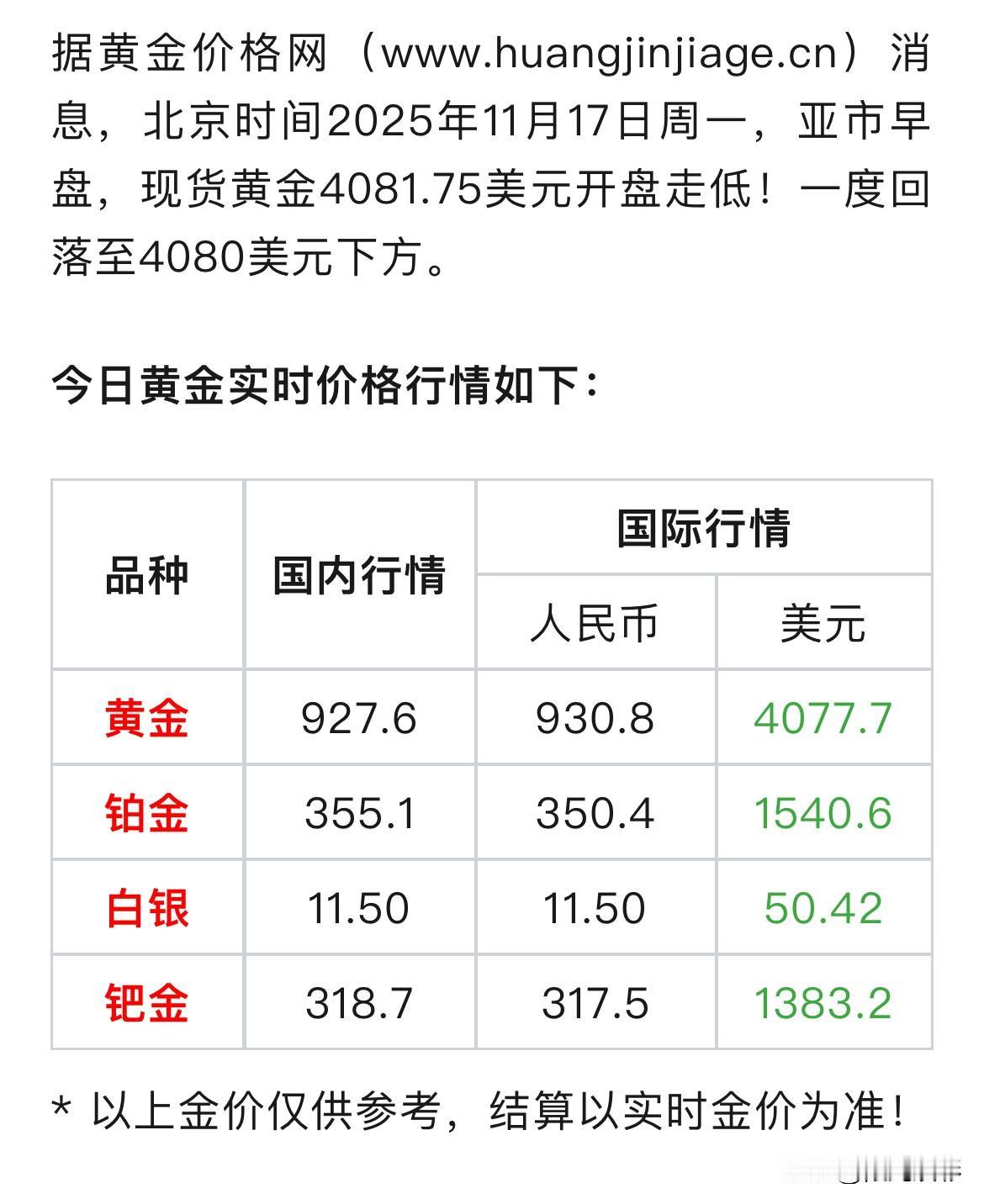 炸天了,又降了! 黄金价格又下降了! 11月17日 今早最新消息 黄金价格:927.6元/克 铂金价格:355.1元/克 白银价格:11.5元/克。 钯金价格:318.7元/克 今天钯金价格同比昨日微微上调一点。 所有信息,仅供参考 理财有风险,投资需谨慎 黄金行情价格 金价行情 金价 金价回收行情 黄金售卖价格 实时金价 金金价