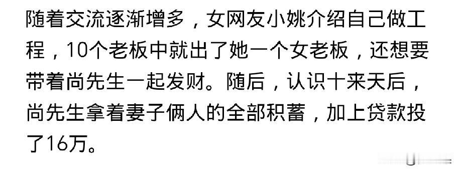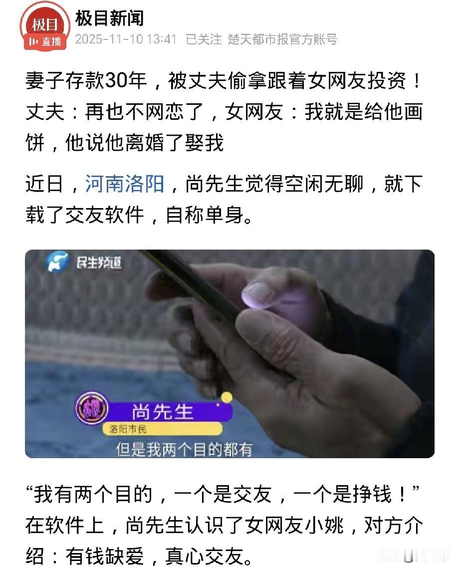 唉,男人就这么不堪。 洛阳一位已婚男士,无聊之际下载了一个交友软件, 他标注自己单身,还声称自己在这个软件上有两个目的,一个交友,一个挣钱。 (看到这我想笑,在交友平台上他还想挣钱。) 结果呢, 他跟平台上一个女人好上了,这个女人标注自己是:有钱缺爱,真心交友。 这真是天作之合,一个想挣钱,一个有钱就缺爱。 两个人卿卿我我好了不久,女的就告诉男的,我带你一块儿挣钱吧,我在一个老板圈里,都是有钱人。 男的当然一脸惊喜,多好的事啊,又能泡妞,又能挣钱。 一拍即合! 然后两人为了一个项目,男的把家里的积蓄30万全部拿出来,还贷了16万给了这个女的。 (这男的缺心眼吧,就是投资也不能一下全部掏空家底啊) 然后呢,就是包子打狗,一去不回了。 后来妻子发现了真相,找那女的说理,那女的面对媒体也很坦然承认,自己就是给男的画大饼呢。 (这哪是画大饼,这可不就是骗嘛) 想起一句话, 真正的猎手往往以猎物的形式出现。 这个女的是在平台上专门钓鱼啊。 偏偏有些男的就吃这一套,但凡有个女的来蹭,就兴奋的不知所以了,就好像没见过女的一样。 天下哪有白吃的午餐啊。