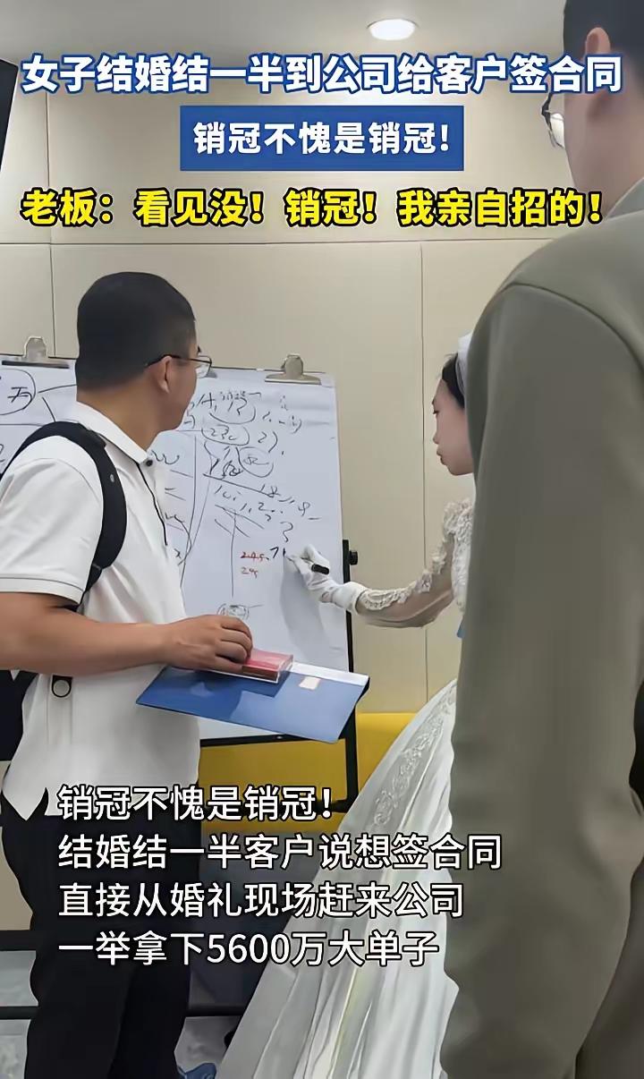 好家伙,不愧是销冠啊!这敬业态度,老板脸都笑烂了[捂脸] 女子结婚到一半的时候,客户突然同意签合同,她毅然决然终止婚礼,穿着婚纱前去签约。一举拿下5600万单子。 估计新郎和一众亲戚朋友在风中凌乱吧。不过也能理解,结婚嘛,啥时候都可以。这笔单子可是好几千万啊,挣钱才是最重要的。 总之恭喜新娘,双喜临门[笑哭][笑哭][笑哭]