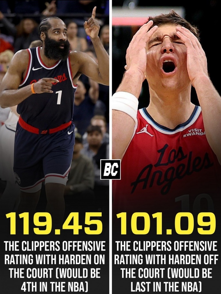 •本赛季哈登在场时:快船队的进攻效率为119.45,这一数据在NBA中排名第四。