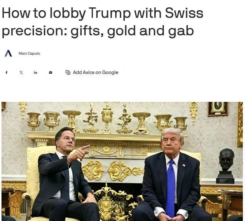 瑞士人是真鬼精,用糖衣炮弹拿下川普! 外媒报道,瑞士人投川普所好,送其豪华“礼物”,成功将美国对瑞士商品的关税税率从39%下调至15%! 据该媒体报道,瑞士的一个商界代表团带着昂贵的礼物抵达白宫,礼物清单包括一块价值13万美元的定制金条和一块劳力士腕表。瑞士的商界代表们对特朗普是极尽奉承,并承诺向美国投资2600亿美元!