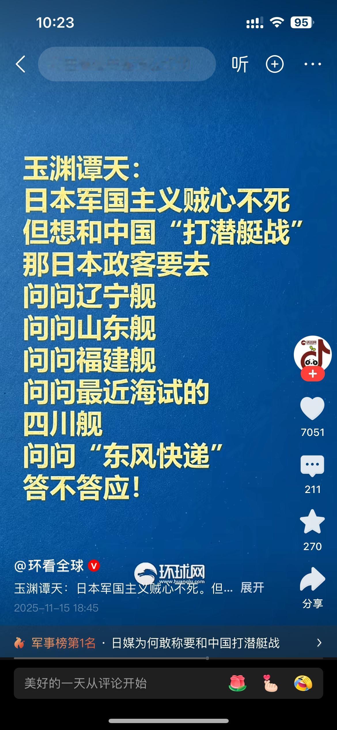 玉渊潭天说的也开始如此生猛了!小本子要和我们打“潜艇战”,那就让他问问辽宁舰、问问山东舰、问问福建舰、问问四川舰,问问“东方快递”,答不答应! 真是“攻守之势易也”!现在我们就有如此底气,对着小本子这样问!既然日本政客想拿着“台湾有事就是日本有事”来找事!那就让他来试试!我们让他知道什么叫“莫伸头,伸头必被咔喳”!