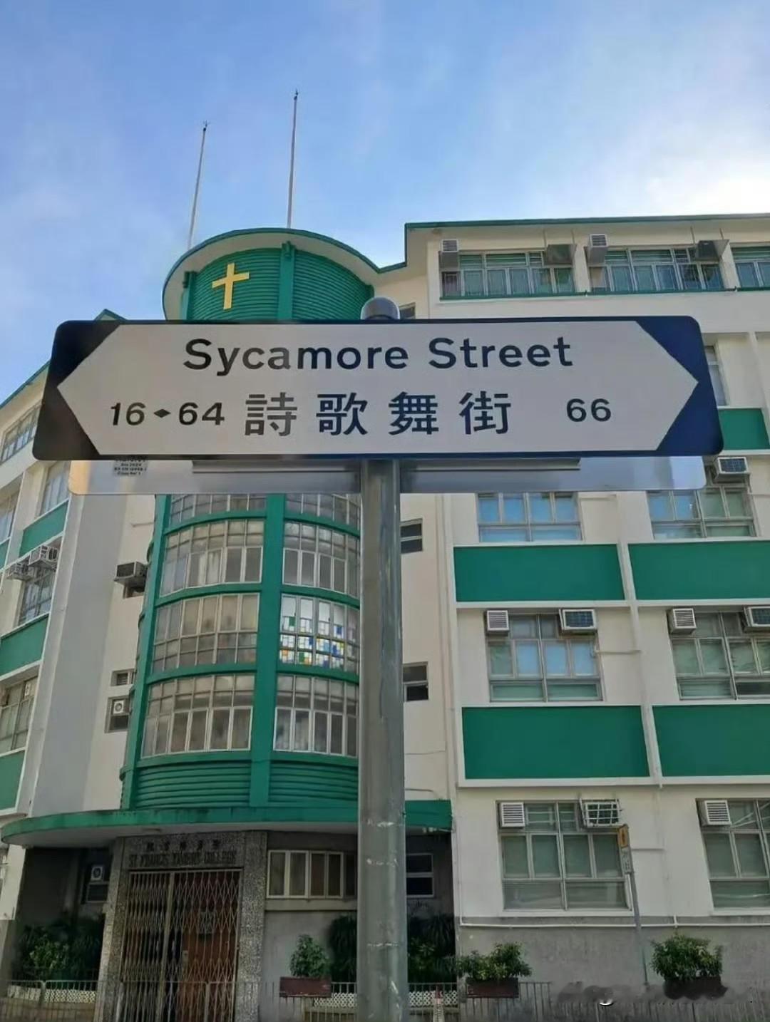 香港的路牌:诗歌舞街 不少内地游客到这条街打卡街牌,认为这个名字太有意思。 这条街位于大角咀,英文名字是Sycamore Street,意思是无花果。 当年中文师爷要翻译成无花果街,结果被华人抵制,认为“无花无果”不吉利,而后把英文音译中文为“诗歌舞街”,听起来更为风雅,也能在中西文化之间取得平衡。
