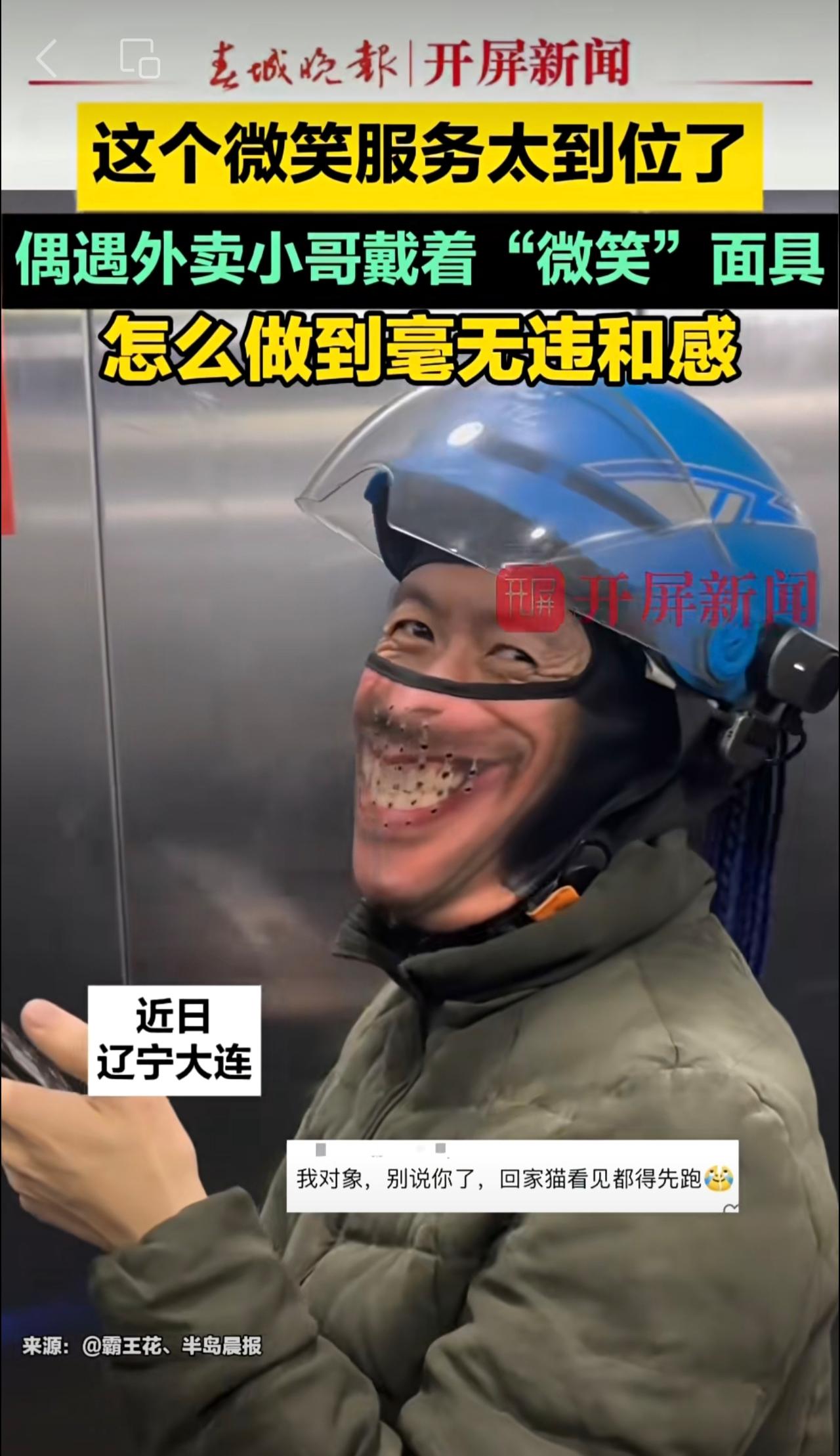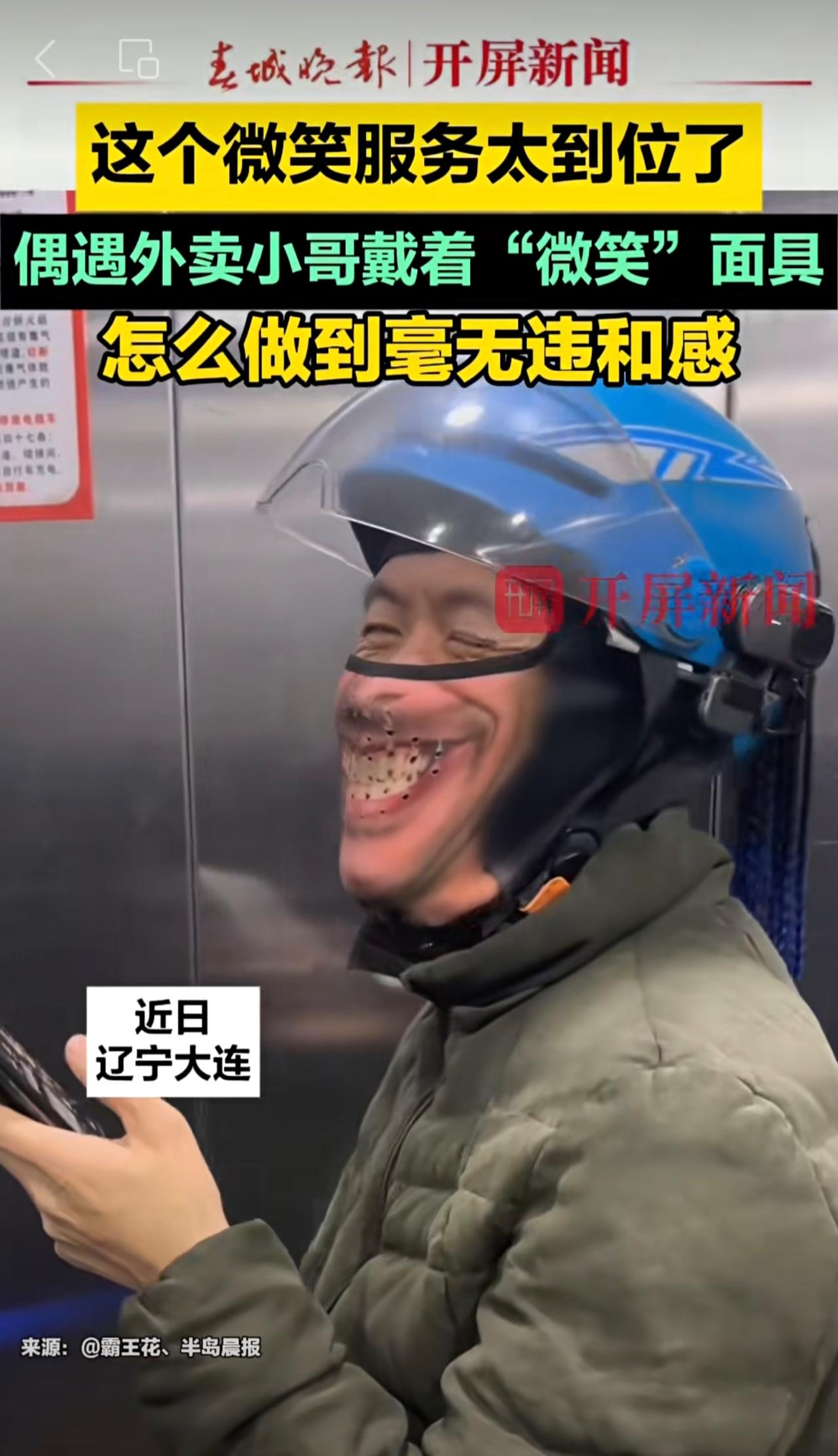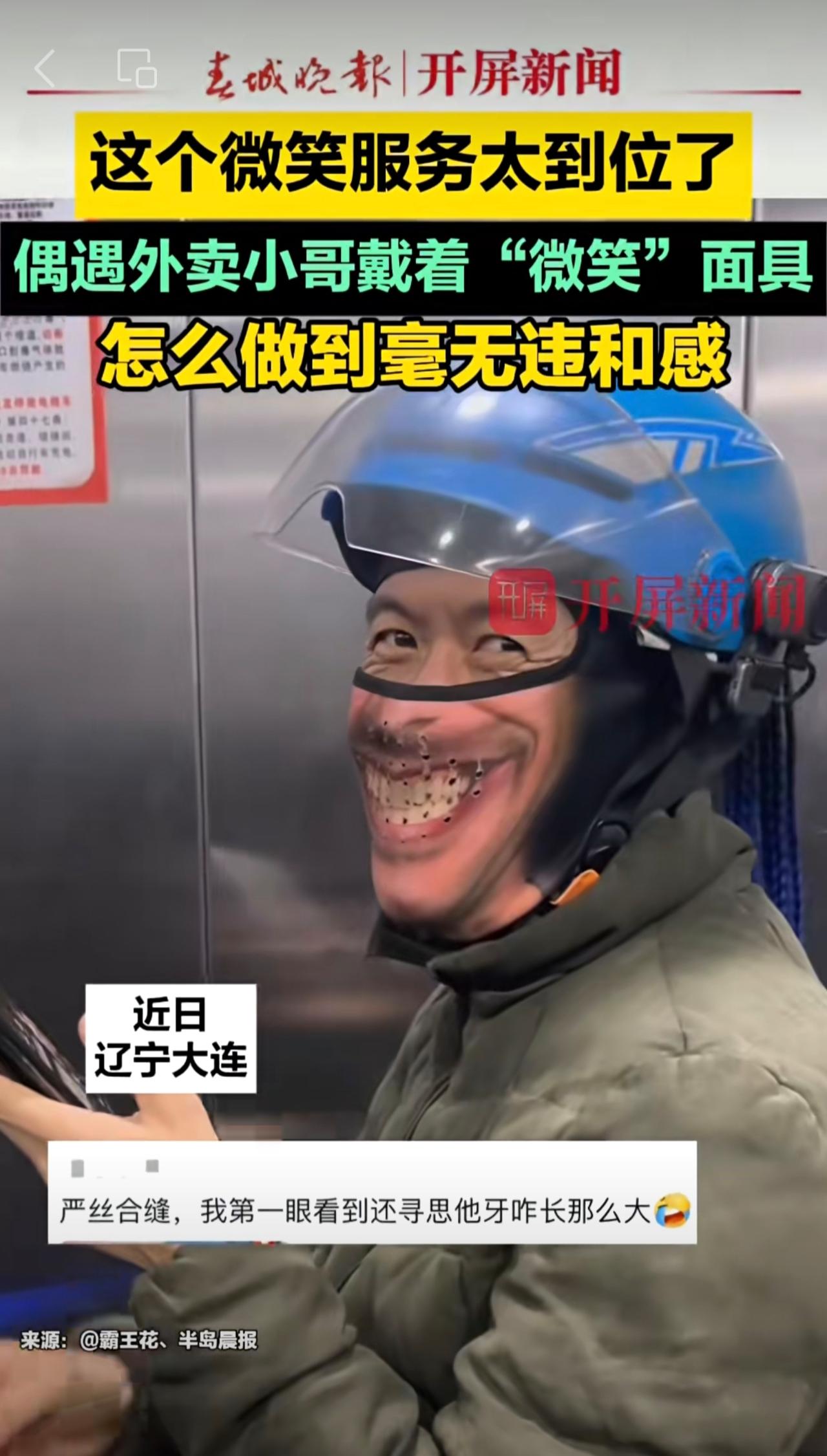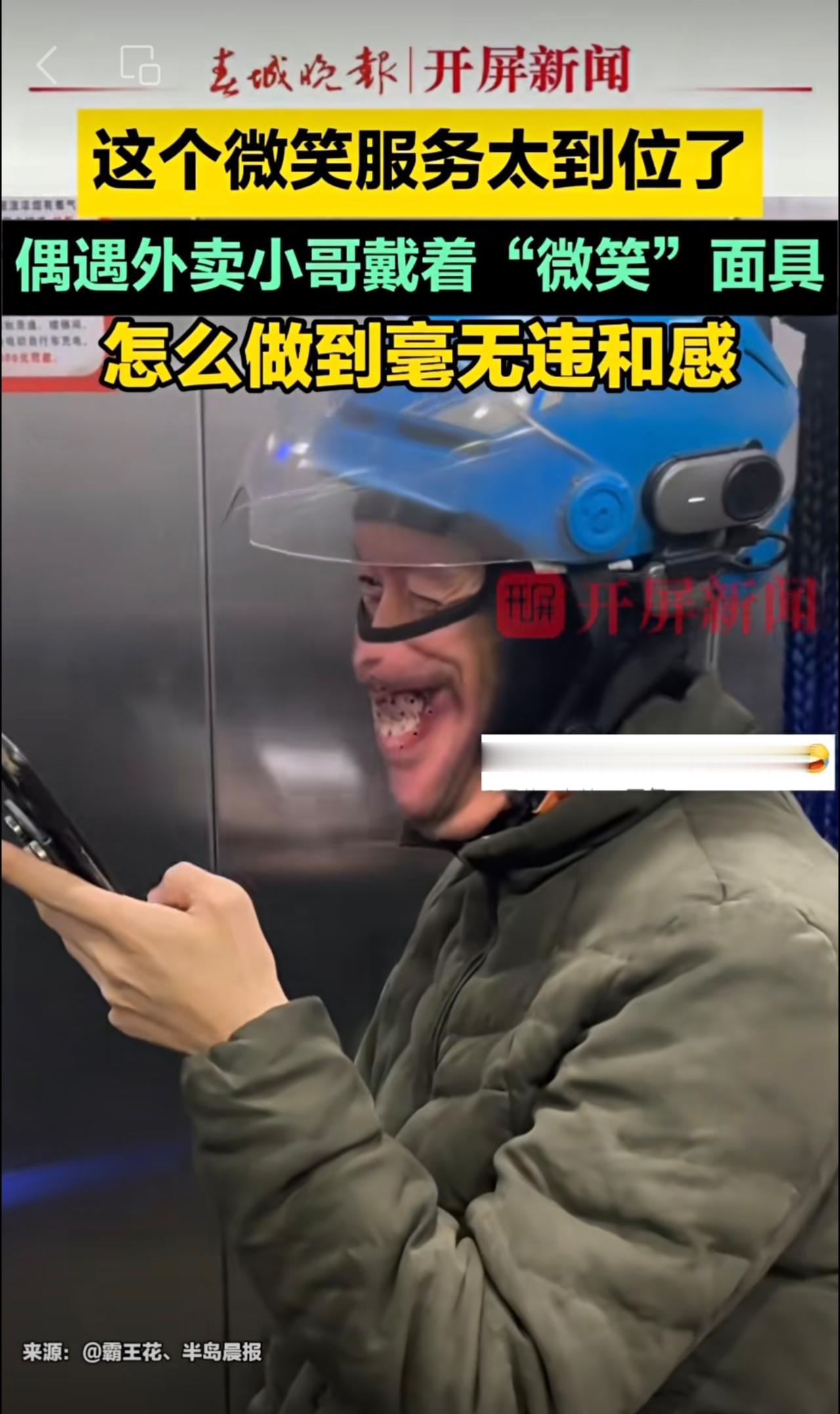 这个微笑服务太到位了,偶遇外卖小哥戴着“微笑”面具,怎么做到毫无违和感。