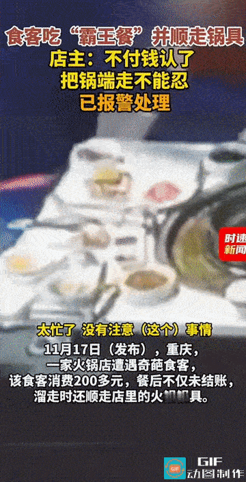 “这就是连吃带拿吗?”重庆,一家火锅店,食客在享受完美食后,不仅未结账,还趁店员忙碌之际悄悄溜走。更离谱的是,他们竟然顺手带走了店里的火锅锅具!老板:干餐饮这么多年,头一次见这种事! 来源:【时速新闻】 原来,当时正值用餐高峰期,店里也比较忙碌,该食客就趁着老板和店员忙碌无暇顾及之时,偷偷的溜走了! 后来,等到店员过来收拾桌子和餐具之时,这才发现桌子上的锅竟然不见了! 得知消息的老板这才调取监控,这才发现事情的真相——之前坐在这桌的食客不仅没有结账,离开时更是直接把锅给顺走了! 老板看着监控画面里的这一幕,既生气又好笑。自己开店这么多年,也遇见过吃霸王餐的,但把锅顺走的还是第一次遇到! 老板说,没有付钱他们也认了,但把锅端走绝对不能忍! 目前,老板已经报警处理了! 俗话说得好“林子大了,什么鸟都有”,吃霸王餐的事常有,这把人家的锅带走了这种“连吃带拿”的行为可真是独一无二,让人开了眼界了! 真不知道这人是什么心态? 难道真的是穷的连锅都买不起了吗? 我想更多的还是贪婪吧——贪小便宜习惯了,不管什么看见什么总想着占为己有! 这种人就算贪得一时小利,但总有一天会受到法律的惩罚,就像这次,老板报警后,他终归是逃不掉的! 那么,面对霸王餐行为,商家应当如何维护自身权益? 法律专家指出,报警或许是一种最直接、最有效的维权方式。 用法律保护自己,不仅可以追回损失,更能起到警示作用,抵制不良行为和风气! 诚信不是小事,它关乎每个人的尊严和这个社会的温度! 一个连吃饭都不愿付钱的人,又怎能在人生的其他方面赢得尊重?