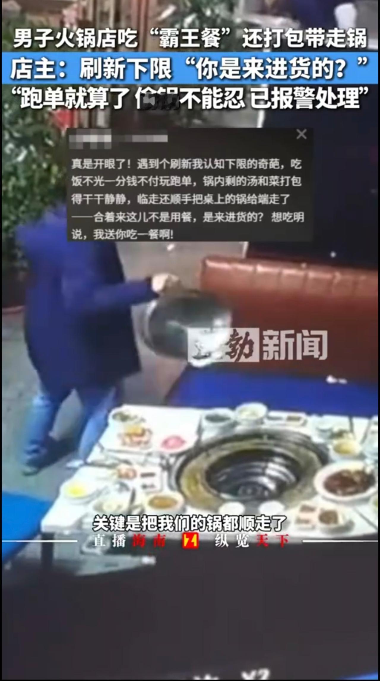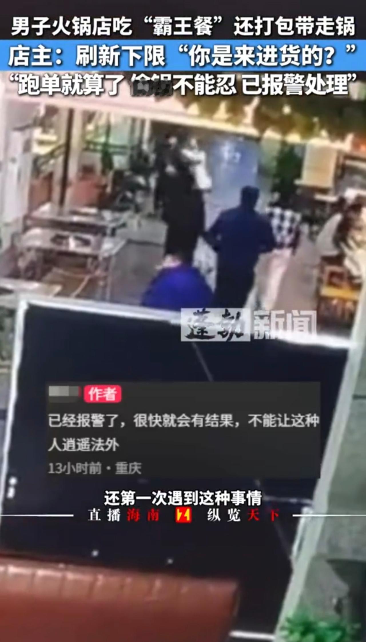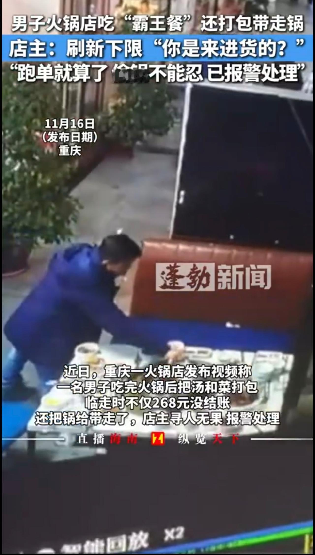 男子吃火锅没付钱还把锅顺走,店主:不付钱认了,锅端走不能忍,已报警处理。11月15日 重庆