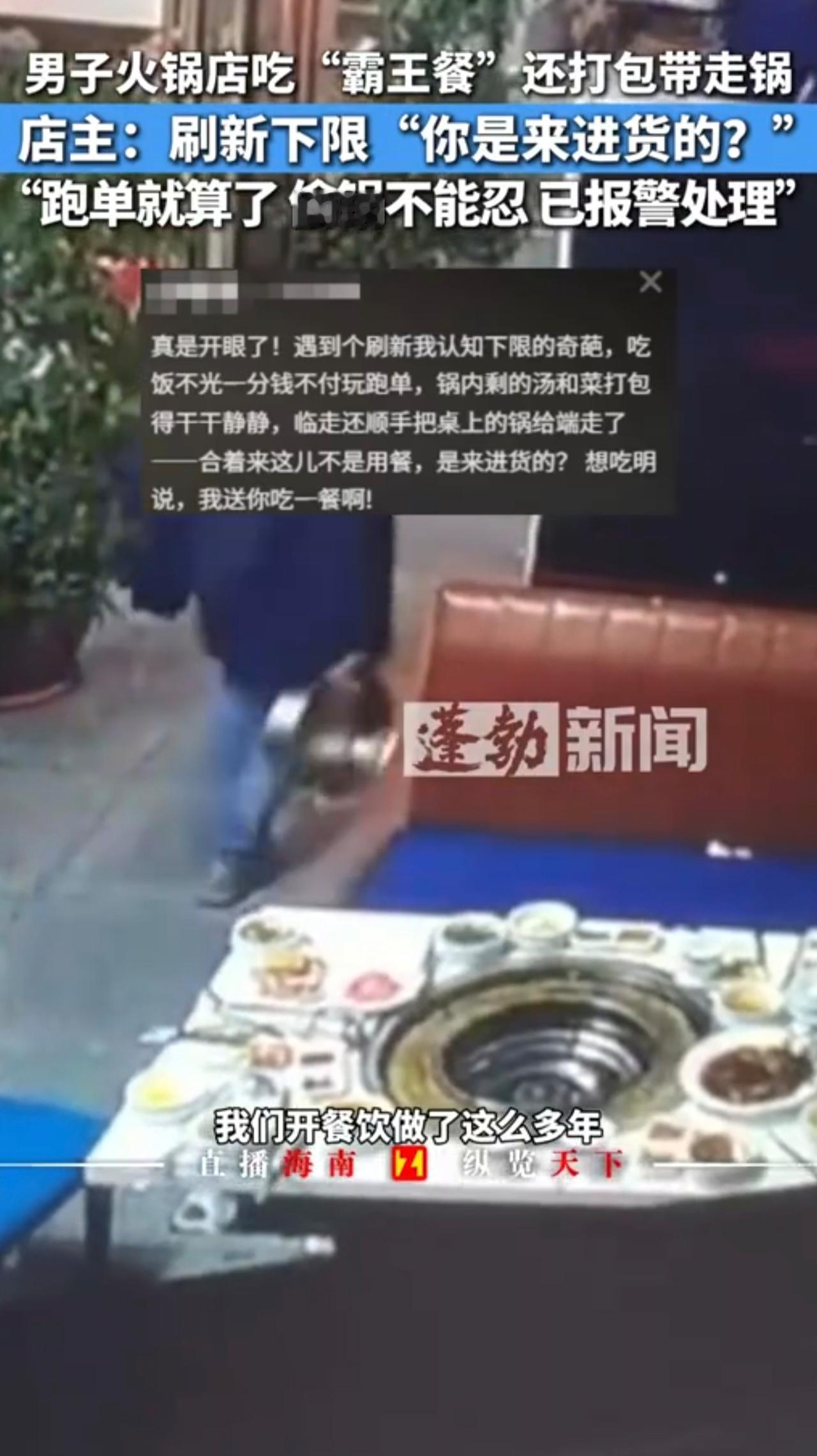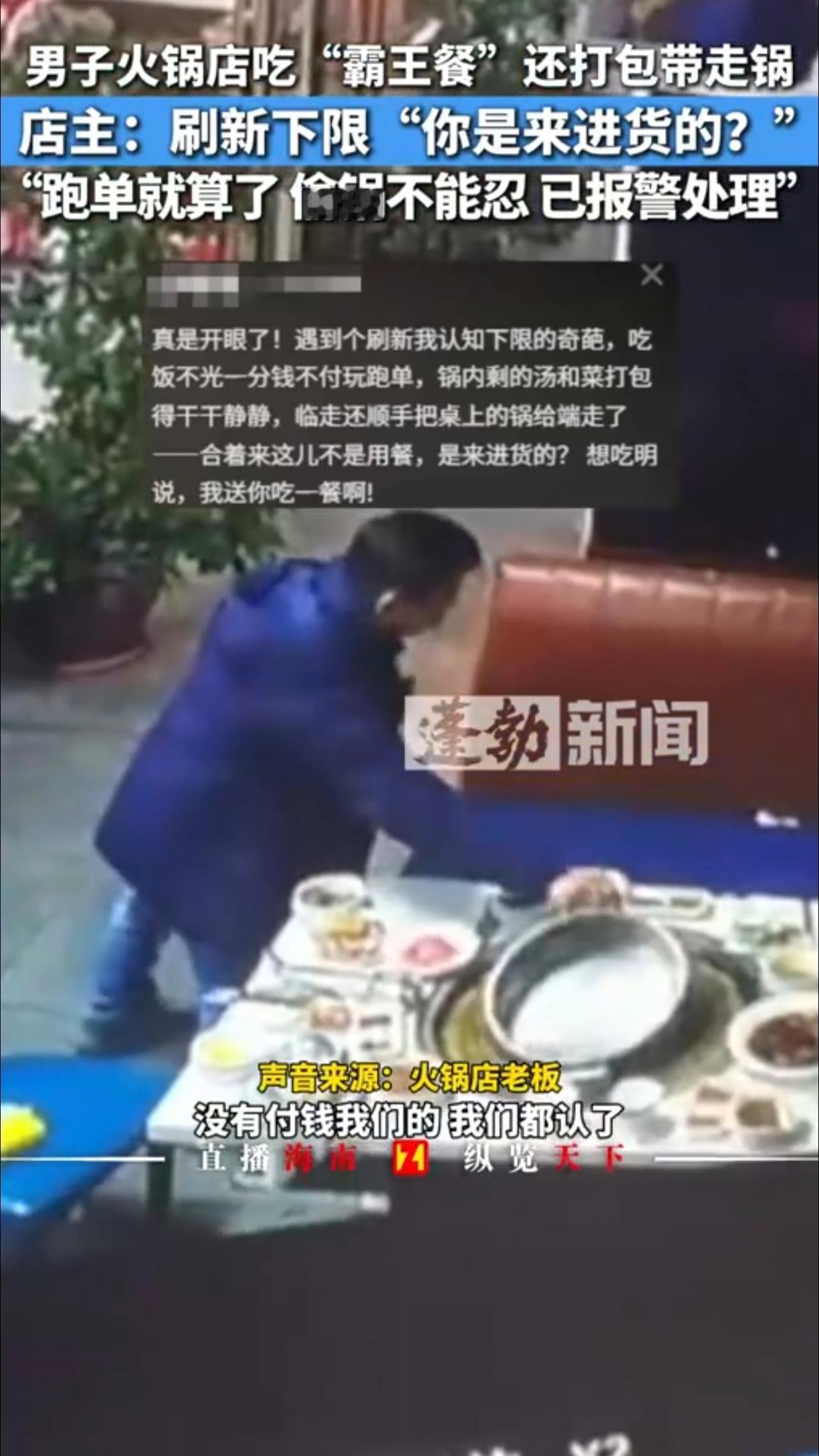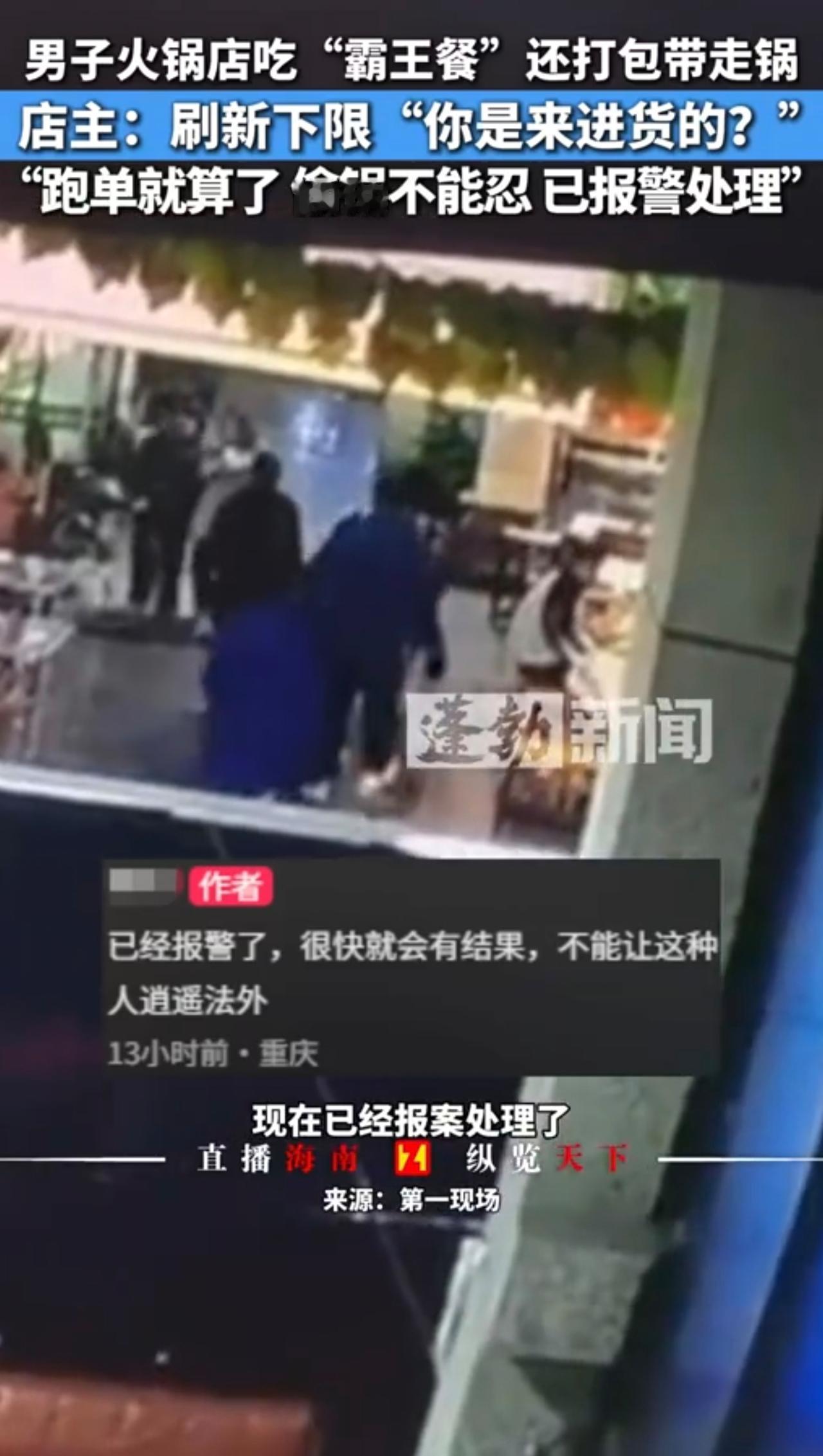 男子吃火锅没付钱还把锅顺走,店主:不付钱认了,锅端走不能忍,已报警处理。11月15日 重庆