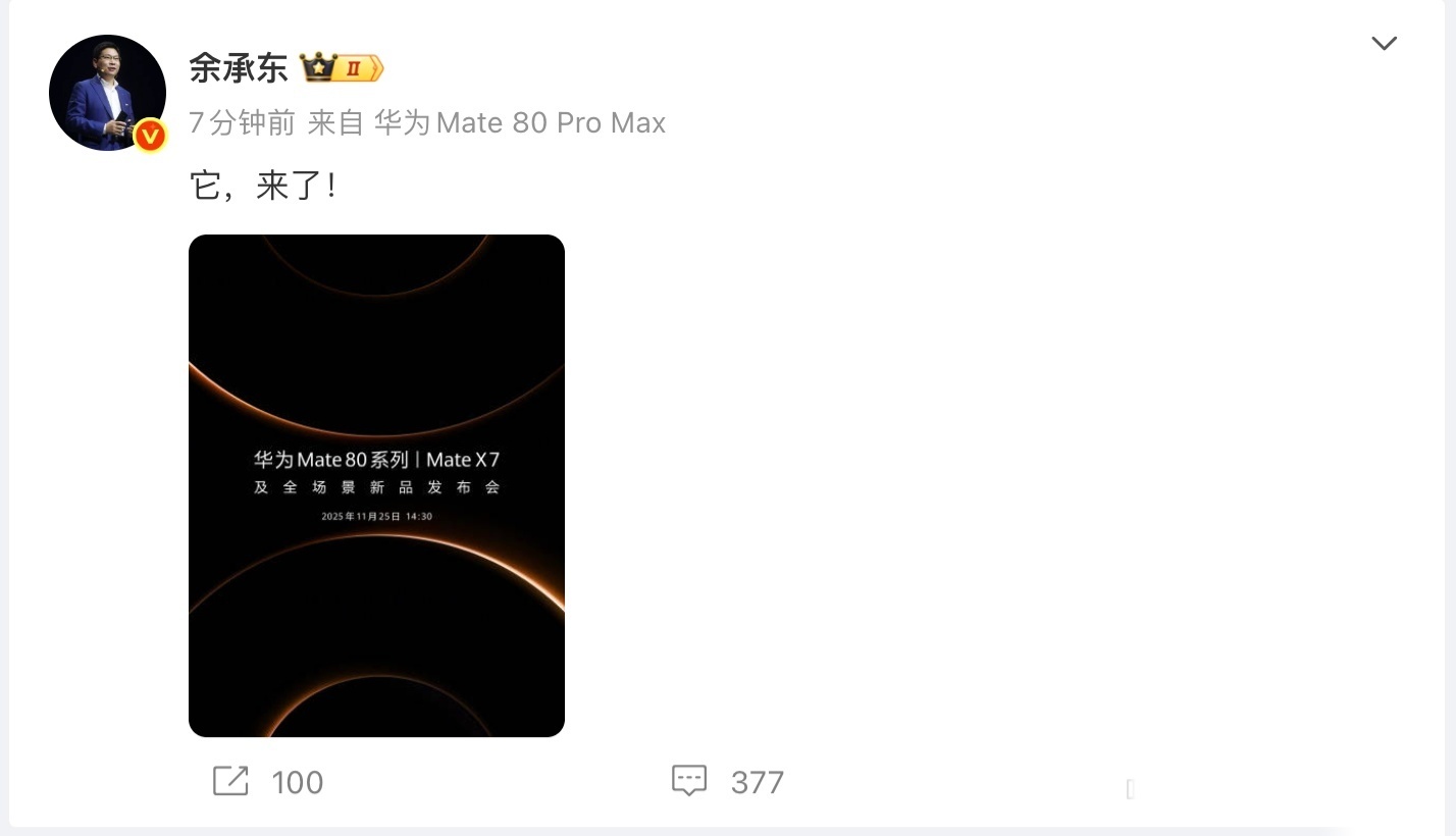 Look!华为 Mate 80 Pro Max喜欢Mate大屏华为旗舰的朋友蹲住了,这一代依旧是3D 人脸识别,背部为中轴对称的经典星环 Deco 设计,根据爆料,处理器为新款麒麟 9030,手机最大将提供 20GB RAM 内存。而华为Mate X7作为旗舰大折叠屏,应该会在影像、续航、性能、鸿蒙6系统生态等多方面带来新表现。发布会定于11月25日