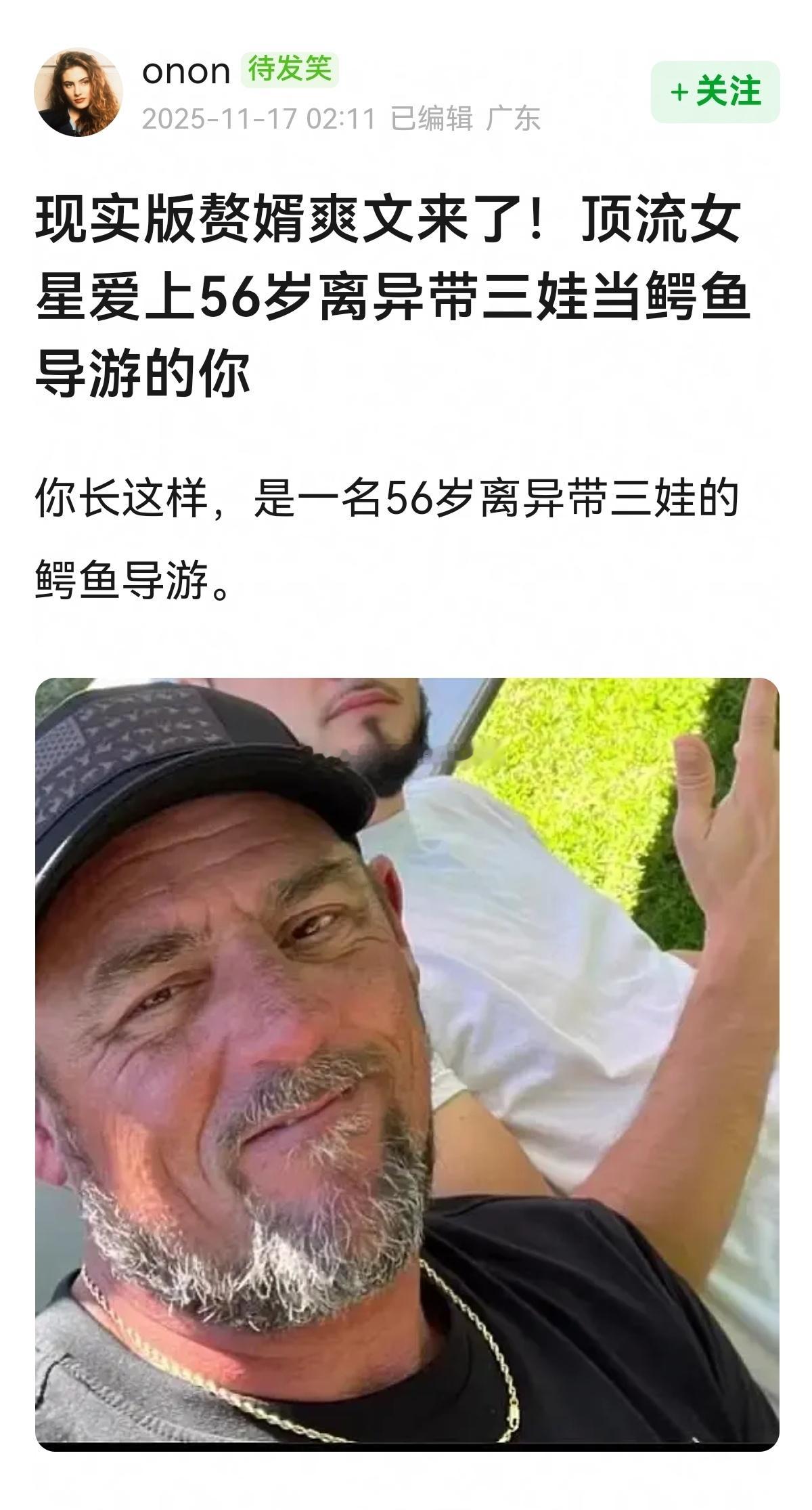 搬→现实版赘婿爽文来了!顶流女星爱上56岁离异带三娃当鳄鱼导游的你。。。