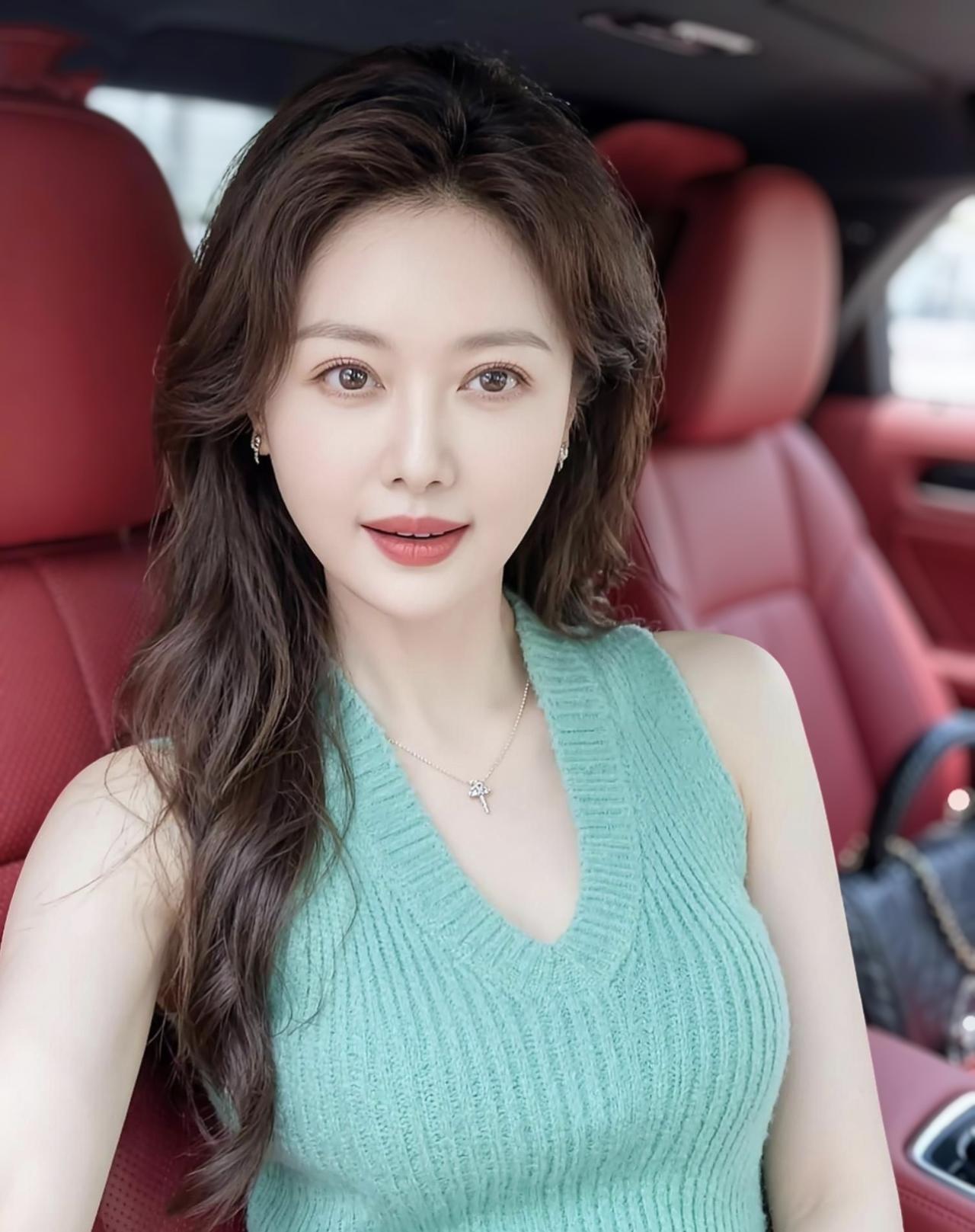 车内自拍,清新薄荷绿连衣裙,温柔微笑,车窗外阳光明媚。