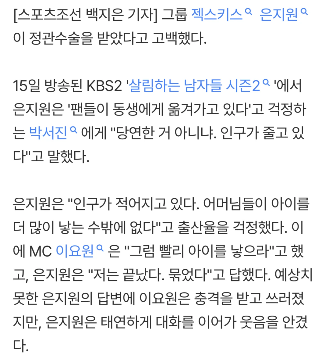 韩国水晶男孩组合成员殷志源坦言自己接受了输🐳管手✂️术。 15日播出的KBS 2TV《做家务的男人们第二季》中,韩国演歌歌手朴瑞镇为弟弟孝定准备了粉丝见面会。殷志源对担心"粉丝们都开始关注我弟弟了"的朴瑞镇说:"这不是理所当然的吗? 人口正在减少。" 殷志源表达了对生育率的担忧:“人口在减少,妈妈们别无选择,只能多生孩子。”对此MC李瑶媛说"那快点生孩子吧",殷志源说"我结束了。 绑起来了。" 殷志源的意外回答让李瑶媛受到冲击晕倒,但殷志源泰然自若地继续对话,引得现场笑声一片。 殷志源上月与比自己小9岁的造型师再婚。 两人相识多年后发展为恋人,只邀请家人和亲朋好友举行了非公开婚礼。 之后,殷志源透露了他想要孩子的计划,他说:“有些人多次试🧪管失败后放弃了,最后却自然怀🤰孕了。我也有同感。如果能自然怀🤰孕,我会欣然接受。”然而,他却出人意料地坦白自己已经做了输🐳管结✂️扎。 每秒都值得记录 韩国综艺 做家务的男人第一季 做家务的男人第二季 我家的熊孩子 殷志源 水晶男孩 撩生撩死殷志源 全世界最好的殷志源 新西游记殷志源 姜食堂 第三季[eoi]