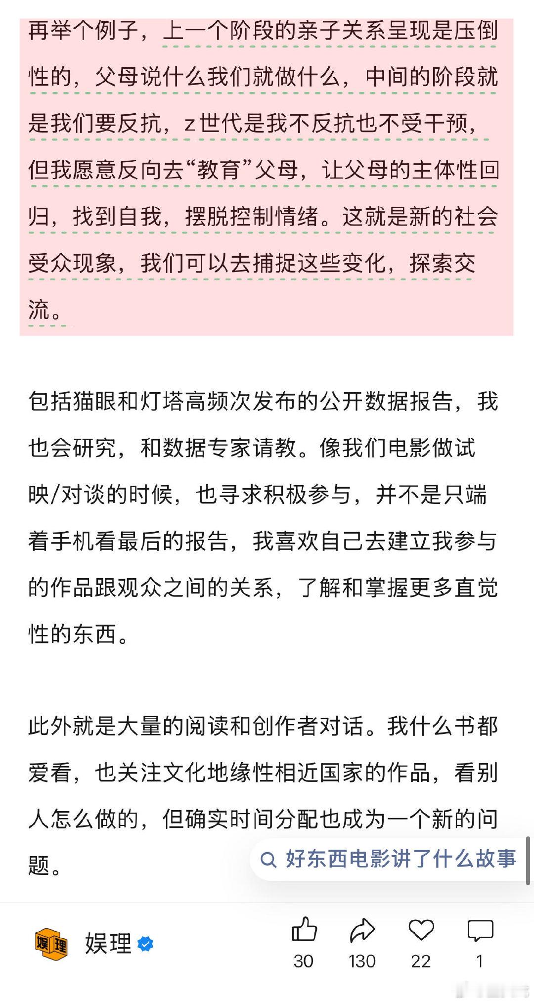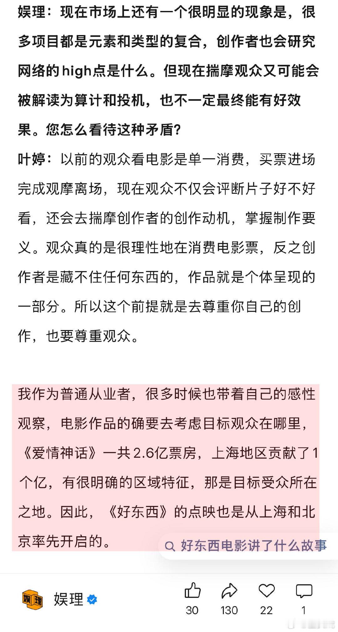 谈及电影项目的符合趋势及观众反馈之间的矛盾,《好东西》制片人叶婷直言观众是在很理性地消费电影票,“我作为普通从业者,很多时候也带着自己的感性观察,电影作品的确要去考虑目标观众在哪里,《爱情神话》一共2.6亿票房,上海地区贡献了1个亿,有很明确的区域特征,那是目标受众所在之地。因此,《好东西》的点映也是从上海和北京率先开启的…”↓