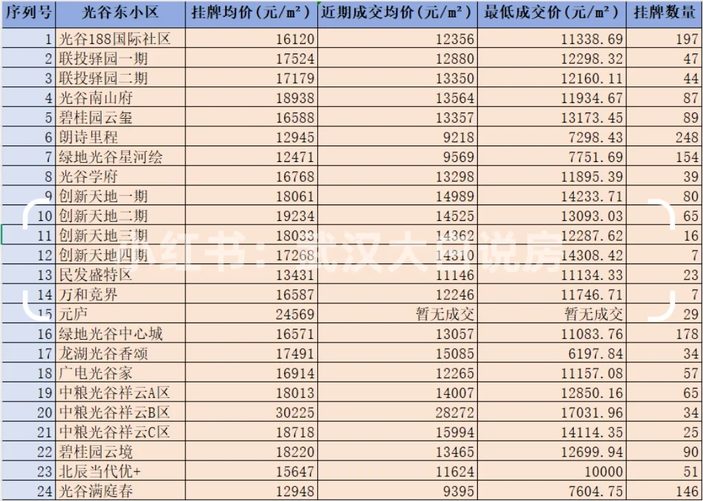 光谷东蕞新二手房成交价汇总,总共汇集了光谷东目前34个二手小区,应该说是比较全面了,主要给大家统计了目前的挂牌均价,挂牌套数,蕞新成交价(截止10月31日),蕞低成交价(历史最低成交价),给大家一个参考,如果还有具体想了解的数据,可以进👗了解或者问我