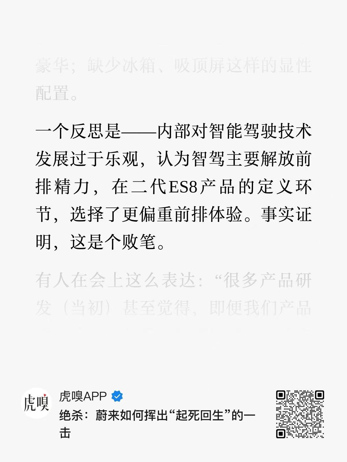 经历了如此大的压力之后,一个更加务实的蔚来,才有了ES8的成果。当年对于辅助驾驶过度乐观,在还没有成熟的产品时,已经有了后续的产品规划和庞大的组织配套。事实证明,这是错的。