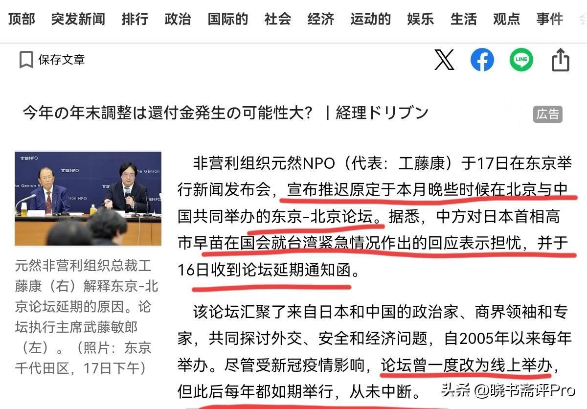日本麻烦大了!东京-北京论坛被暂停!11月17日,根据日媒报道,日媒称,原定于本月晚些时候在北京与中国共同举办的东京-北京论坛被暂停。日本方面称,中方对日本首相高市早苗在国会就台湾紧急情况作出的回应表示担忧,并于16日发出论坛延期通知函。 很显然,该论坛被暂停,日本方面明显感到不同寻常。为什么这么说呢?事实上,该论坛汇聚了来自日本和中国的政治家、商界领袖和专家,共同探讨外交、安全和经济问题,自2005年以来每年举办,在疫情期间都不曾中断,而现在被暂停,这说明什么呢?这说明高市早苗的言论对于中日两国正常的交往产生了实质性影响。 而事实上,就在日本方面发现这一重要论坛被暂停之后,我们还曝出了一个更大的消息,那就是在南非G20峰会期间,我方明确表示不会有与高市早苗有任何的会晤安排。很显然,不撤回恶劣言论,日本的麻烦越来越大。某种程度来说,中日的高层外交及其它层面的外交正在进入事实上冻结的状态。 而一旦外交关系被冻结,中日其它方面的合作将极有可能全部被暂停。鉴于日本正面临美国开出的苛刻的贸易条件,现在又与最大的贸易伙伴——中国关系这么僵,高市早苗政府的麻烦无疑会越来越大。以中日经济体量,显然日本更加需要我们,高市早苗正让日本进入到一个巨大的困局之中。