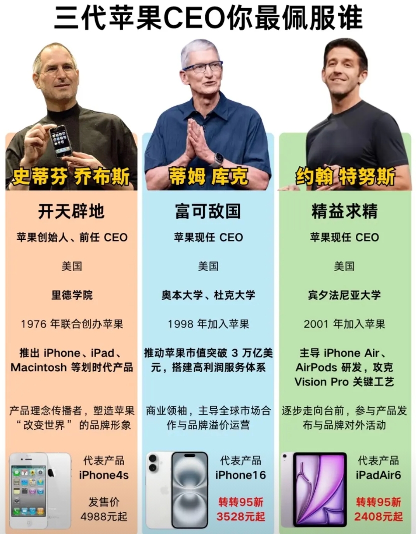 三代苹果CEO各有千秋,你更服谁? 乔布斯是“开创者”:1976年创苹果,推出iPhone、iPad改写行业,把“改变世界”刻进品牌基因,iPhone4s是他的经典作品。 库克是“商业王”:1998年加入,把苹果市值推到3万亿,靠服务体系赚高利润,现在iPhone16是他任期的代表机型。 特努斯是“技术派”:2001年入职,主导iPhone Air、AirPods研发,还啃下Vision Pro的工艺难题,如今逐渐走到台前。 这三位的风格你更喜欢哪种?要不要我帮你整理一份苹果三代CEO核心成就表?