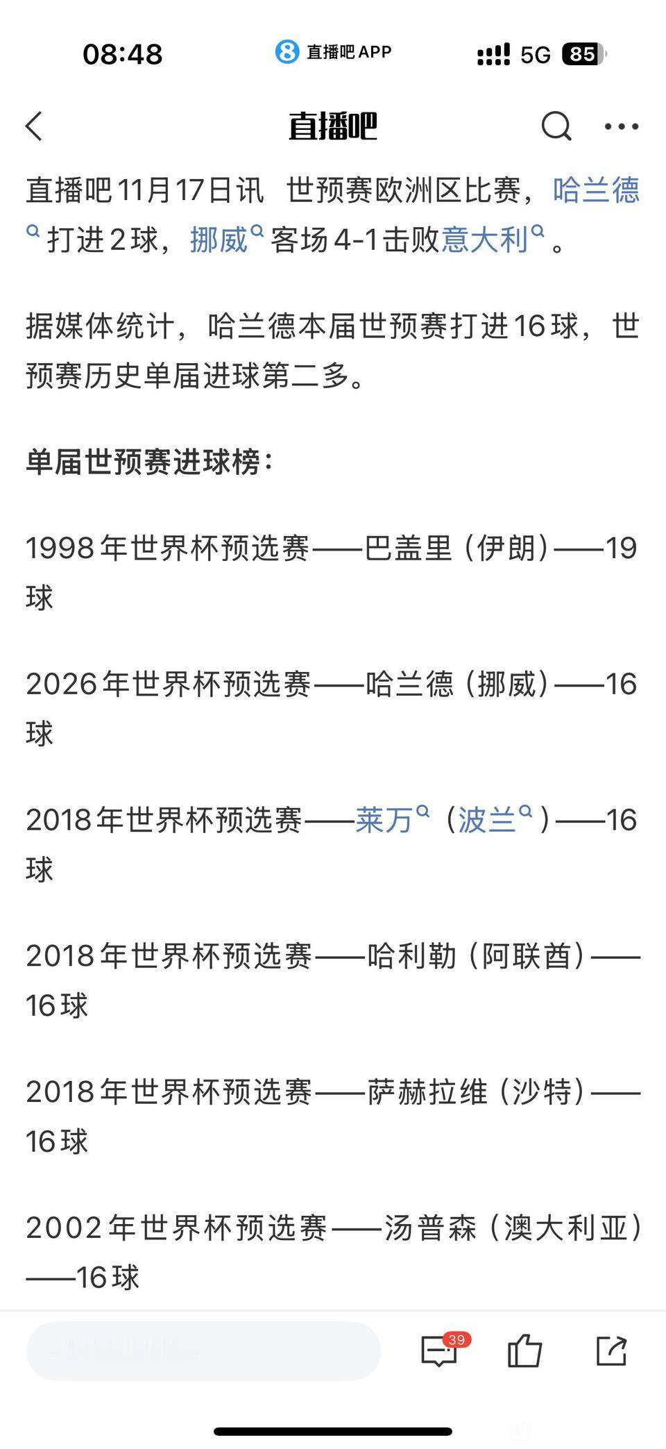 今年哈兰德跟2018年莱万进球一样。 他俩都是16球,在世界杯预选赛历史排第二。 第一名是伊朗球员,没有人认识吧。 说明哈兰德巅峰,已经跟莱万差不多。 莱万应该有一座金球奖,哈兰德未来至少也能拿一次吧。[灵光一闪]