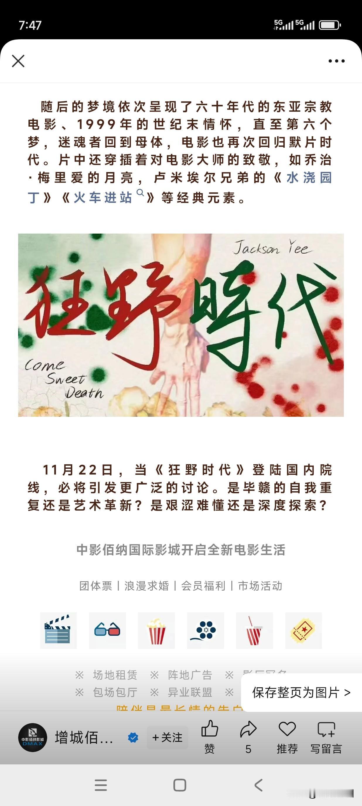 这广告做的可以,至少不像有的商家点赞99送 活动场免费送【《狂野时代》易烊千玺海报】您来一定送!看电影首选中影佰纳,转发朋友圈集赞5个,凭电影票免费送海报1张。