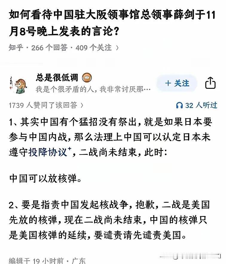 还是网上能人多,一名网友说:日本是二战签了投降协议的战败国,如果日本参与了中国的内战,就说明他们不遵守投降协议,可视为二战还没有结束,中国就可以向日本投放核弹。如果日本指责中国发起核战争,中国就可以说:现在二战还没有结束,中国投核弹,只是美国投核弹的延续,是美国先投的,要怪也应该先怪美国。