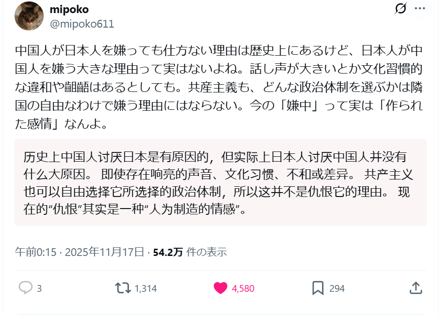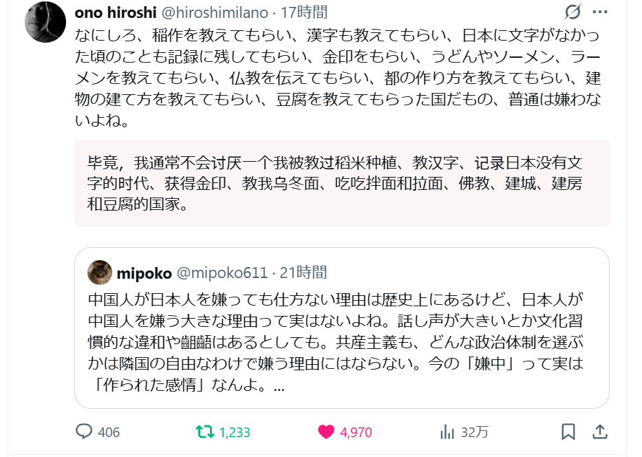 很多日本人倒是很清醒高赞原po:中国人讨厌日本人,是有历史原因的;但日本人讨厌中国人,其实并没有什么大的理由。顶多就是讲话声音大、文化习惯不同、沟通产生摩擦这种层面的事。至于共产主义——一个国家选择什么政治体制,是它的自由,根本算不上被讨厌的理由。现在的“仇中”“厌中”情绪,其实很大程度上是被制造出来的情绪。高赞转发:毕竟,日本是一个被教会了种稻、被教会了汉字、在没有文字的时代还被对方帮忙记录历史、被赐予金印、被教会了乌冬、素面、拉面、被传入佛教、被教会了都城的建造方式、被教会了建筑技法、被教会了豆腐的国家。按理说,是没理由去讨厌对方的吧。