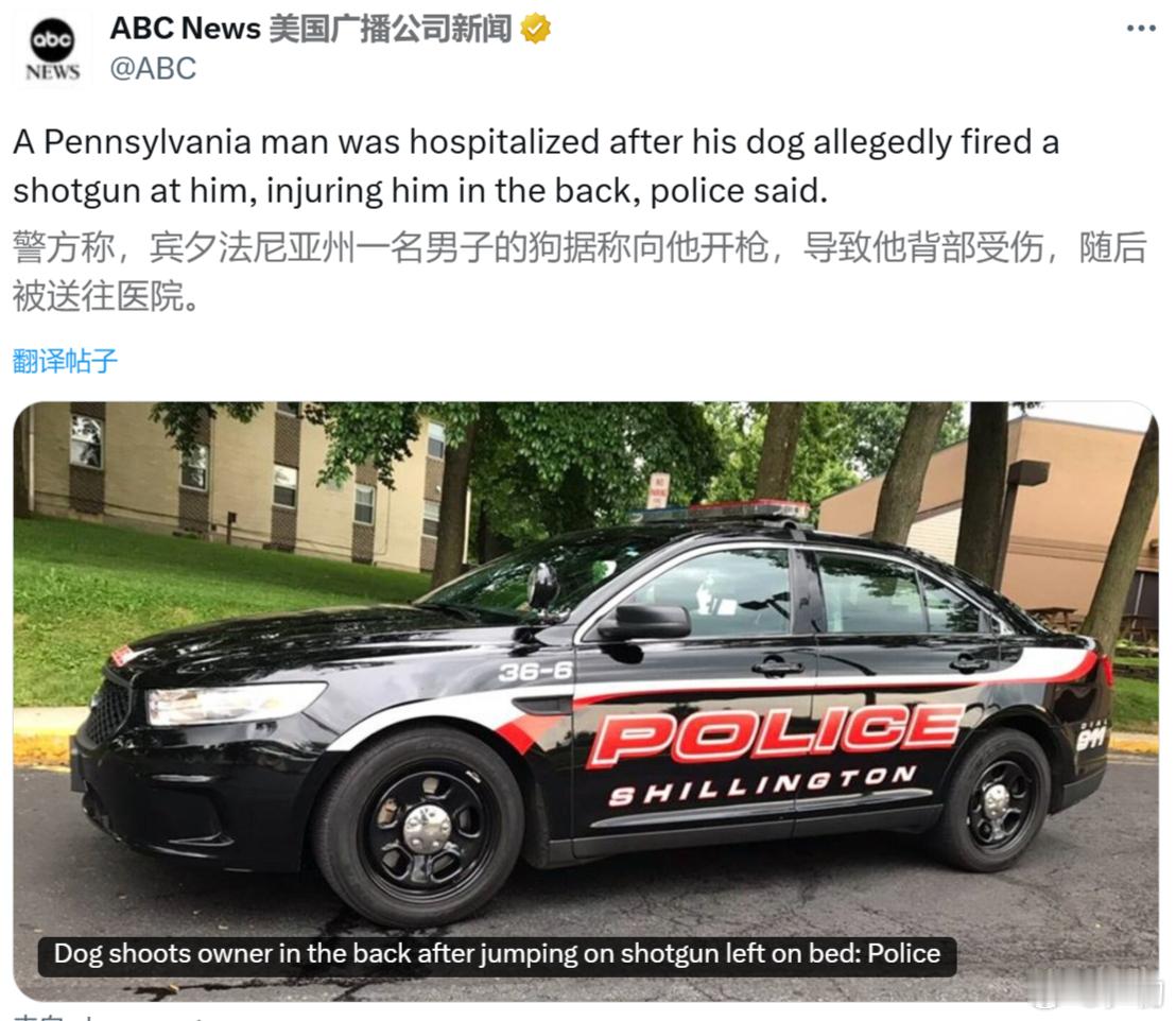 美国宾夕法尼亚州一名53岁男子被自己的狗用霰弹枪击中背部受伤,目前正在医院接受治疗。警方称,狗跳到主人放在床上的猎枪上,击中主人背部,伤势比较严重。在中国,人咬狗甚至狗咬人都会上新闻。在美国,人开枪杀人都不一定上新闻,但狗开枪杀人会上新闻。
