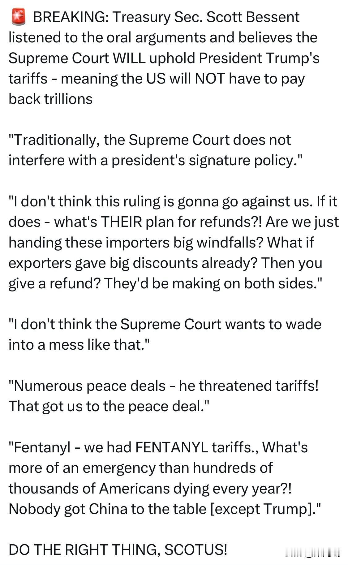 突发新闻:美国财政部长斯科特·贝森特表示,他听完口头辩论后相信最高法院将维持川普总统的关税政策——这意味着美国不需要返还数万亿美元。 贝森特说: “从传统上看,最高法院不会干预总统的招牌政策。” “我不认为这次裁决会对我们不利。如果真的判我们输——那他们(最高法院)有什么退款计划?! 我们要把巨额意外之财送给进口商吗? 如果出口商之前已经给出大幅折扣?那你还要给他们退款? 这样他们两头都能赚。” “我不认为最高法院会愿意跳进这么一团乱麻里。” “无数和平协议——都是因为他(川普)威胁要加征关税!这样才逼成了和平协议。” “芬太尼——我们对芬太尼搞过关税。每年有数十万美国人死亡,还有什么比这更紧急的?!没人能把中国拉到谈判桌——除了川普。” 做正确的事吧,最高法院(SCOTUS)!