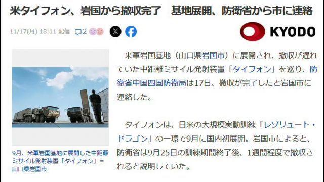 美军“堤丰”中导撤离日本…… 11月17日,驻日美军岩国基地的“堤丰”中程导弹发射装置悄悄撤走了。 “堤丰”可不是普通武器: ➠ 能发射射程1600公里的“战斧”巡航导弹和“标准-6”导弹 ➠ 覆盖范围直指朝鲜半岛、俄罗斯远东乃至中国沿海 ➠ 美军事专家曾直言其“可对亚太构成实质性威胁” 尽管此次撤离暂缓紧张,但美军在菲律宾的“堤丰”至今滞留,未来随时可能“卷土重来”。