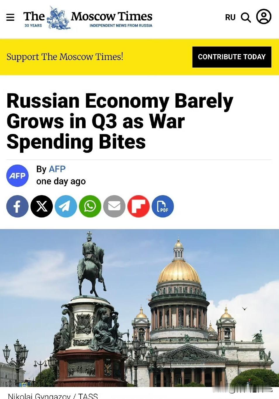 《莫斯科时报》:俄罗斯经济几乎已经走到了尽头。 2025年第三季GDP年增仅0.6%,低于第二季的1.1%,央行目前预计全年成长率仅0.5%-1%。 《莫斯科时报》报道,战争代价和制裁最终开始显现成效。 两年的战争开支让工厂忙碌起来,但也引发了通货膨胀:物价仍以每年 8% 的速度上涨。 为了因应这种情况,中央银行维持高利率,而民用经济则为此付出代价,表现为需求疲软和投资停滞。 俄罗斯企业表示,贷款成本正在扼杀新项目和就业机会。 同时,今年的预算赤字已达约500亿美元,因此克里姆林宫计划将增值税从20%提高到22%,将负担转嫁给家庭和小型企业。 油价下跌是另一个打击。 Fossil fuels仍为州政府带来近五分之一的收入,但原油价格下跌,出口收入也面临压力。 石油价格每损失一美元,克里姆林宫的战争预算缺口就会扩大四倍。 俄乌战争
