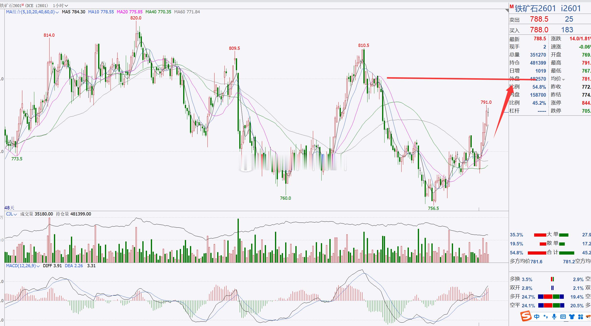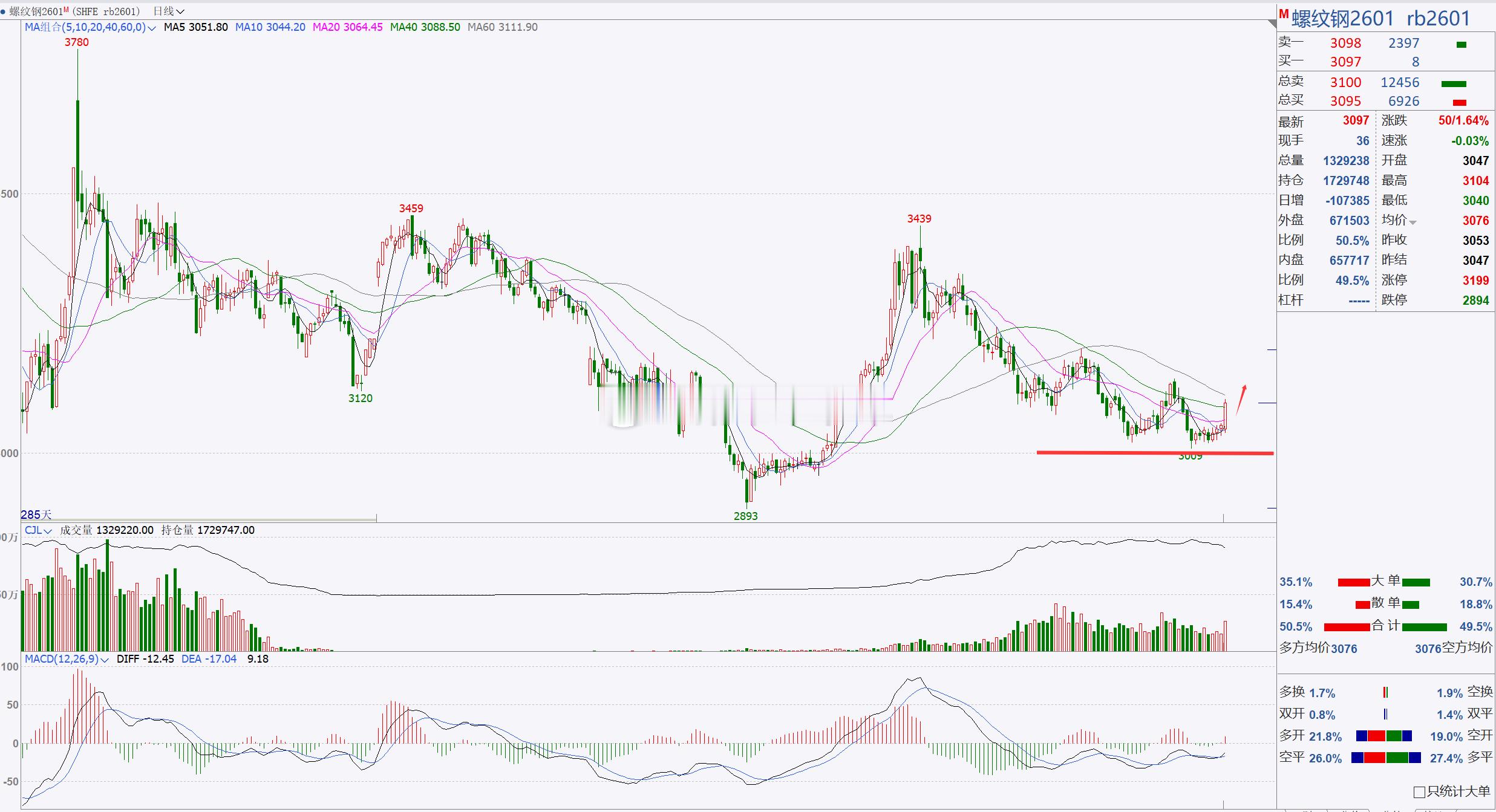 1、【焦煤2601】焦煤关注1200一带,短线跟进!焦煤上周跌破1200一带后,目前伴随着短期反弹调整,行情又重回1200一带,后市我们重点关注此位置,企稳可短线跟进,看短期反弹调整;稳健者建议先观望;例如多关注1200—1190附近,上方先关注1245—1255附近;空关注1245—1255附近再择机考虑介入;(建议仅供参考,具体操作以开盘点位实时跟进,据此操作风险自担)2、【螺纹2601】螺纹短线跟进!螺纹前夕回踩调整,但是行情未能跌破3000一带,目前还伴随着反弹调整,后市我们短线跟进,依旧还是重点关注3000一带;例如多关注3065—3050附近,上方先关注3140—3150附近;空关注3150突破情况再择机考虑介入;(建议仅供参考,具体操作以开盘点位实时跟进,据此操作风险自担)3、【铁矿石2601】铁矿石短线跟进,可先关注800一带!铁矿石日内反弹调整,目前来看铁矿石未能750一带,后市预期会伴随短期反弹调整,建议短线跟进;例如多关注778—775附近,上方先关注800附近,突破再关注810附近;空关注800、810这两个位置再择机考虑介入;(建议仅供参考,具体操作以开盘点位实时跟进,据此操作风险自担)