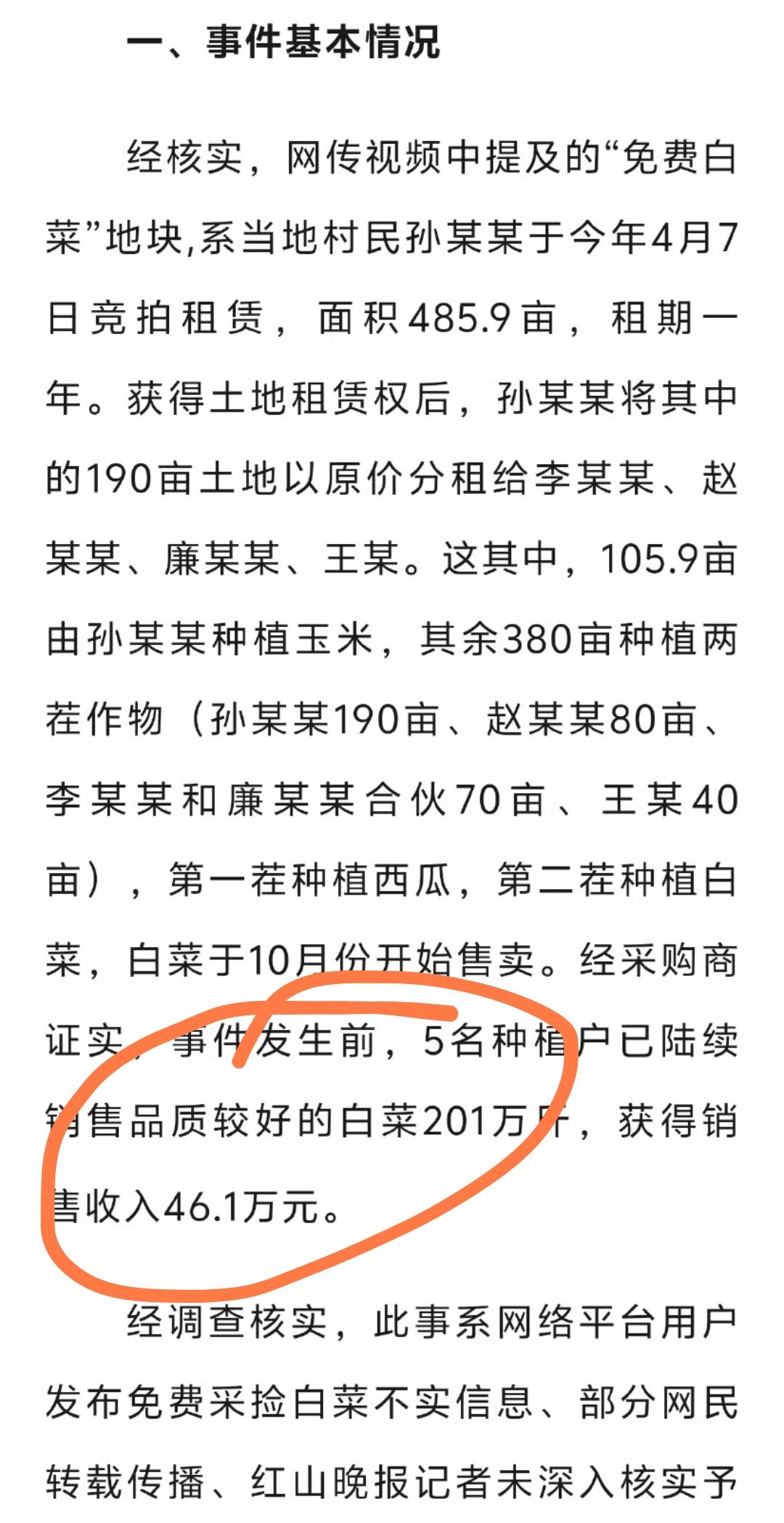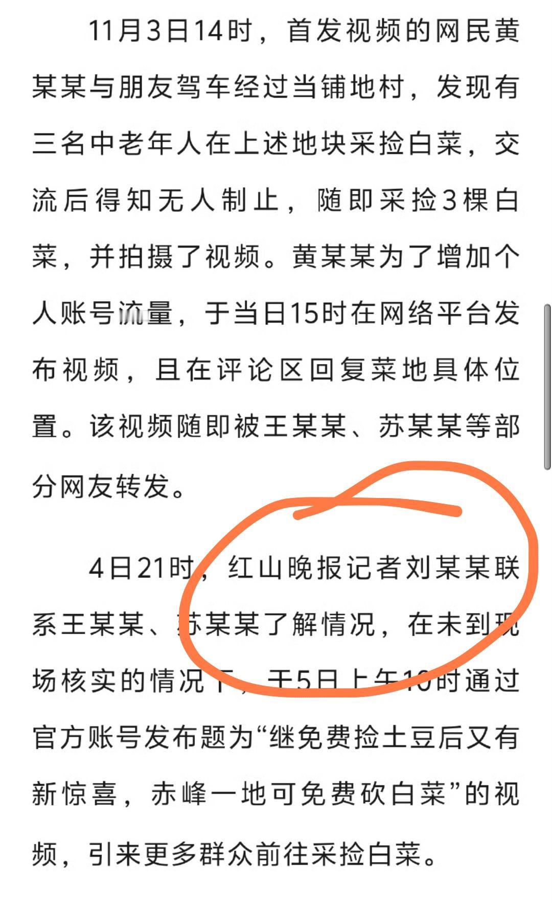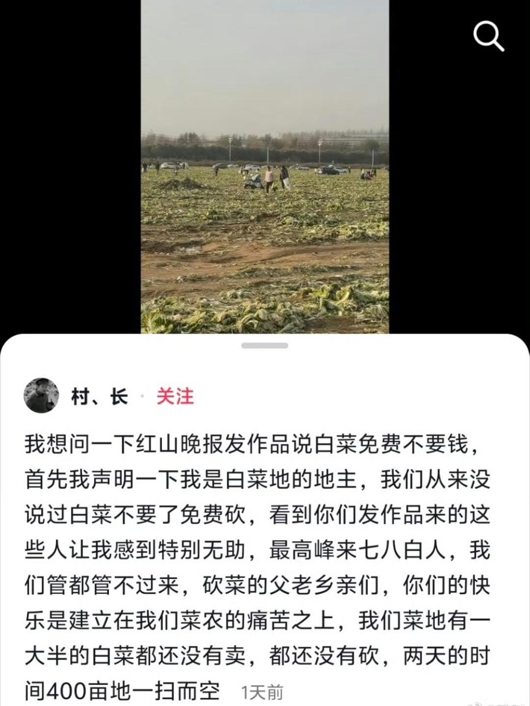 赤峰“免费捡白菜”的通报出来了。 我看了一下,基本是两边都有错。 农户方面,夸大了损失,并没有血本无归损失超过百万。 而是好白菜已经收割完成,赚了将近50万了,剩下的都是质量差一等的白菜。 媒体方面也有问题。 没经过核对就肆意传播谣言,更有哥们用ai合成假视频,造成更多的人去捡白菜,实在可气。 最后万幸,两边协商好了,赔偿的事情也谈好了。 希望以后媒体们长点心吧。 先是免费土豆,后面是免费花生、山药,现在又是白菜。 哪有那么所免费的东西啊。