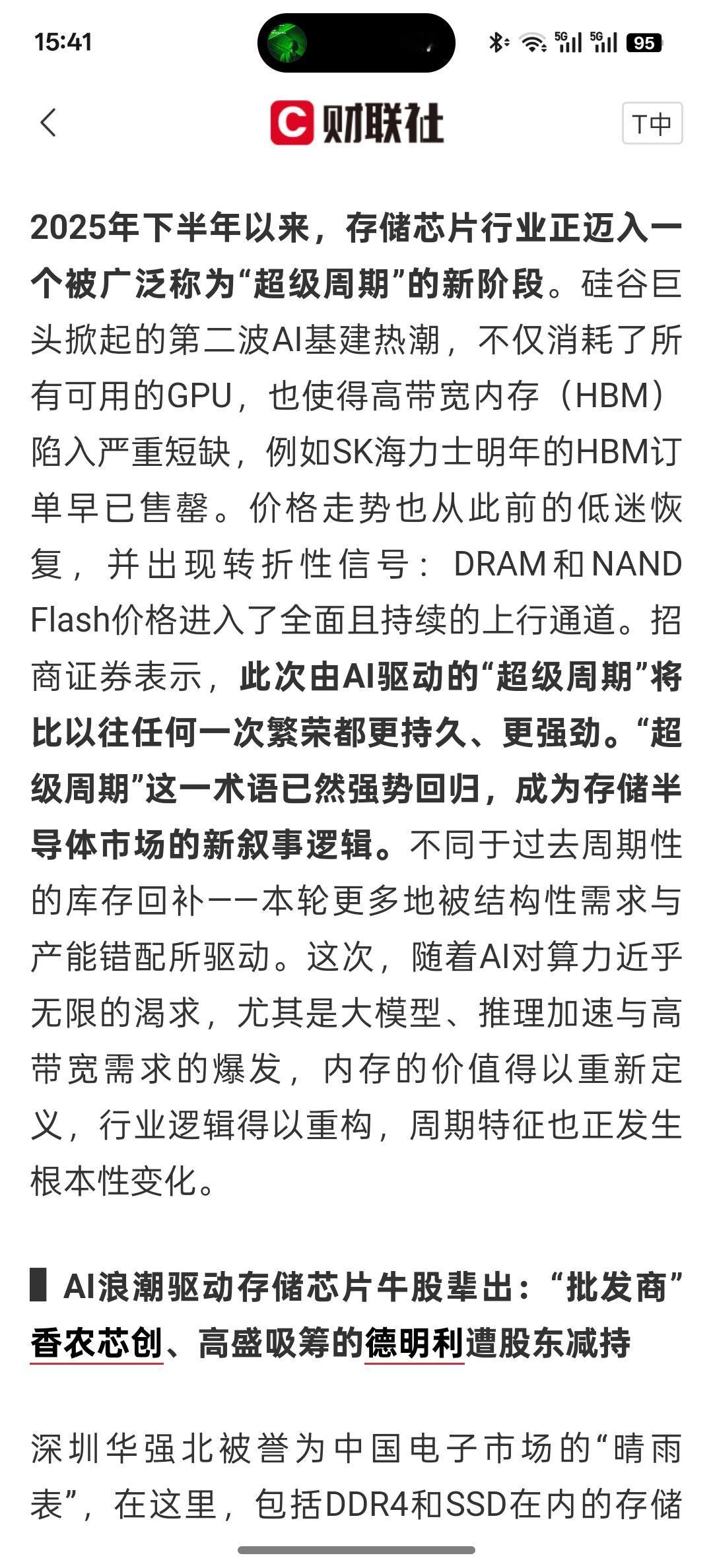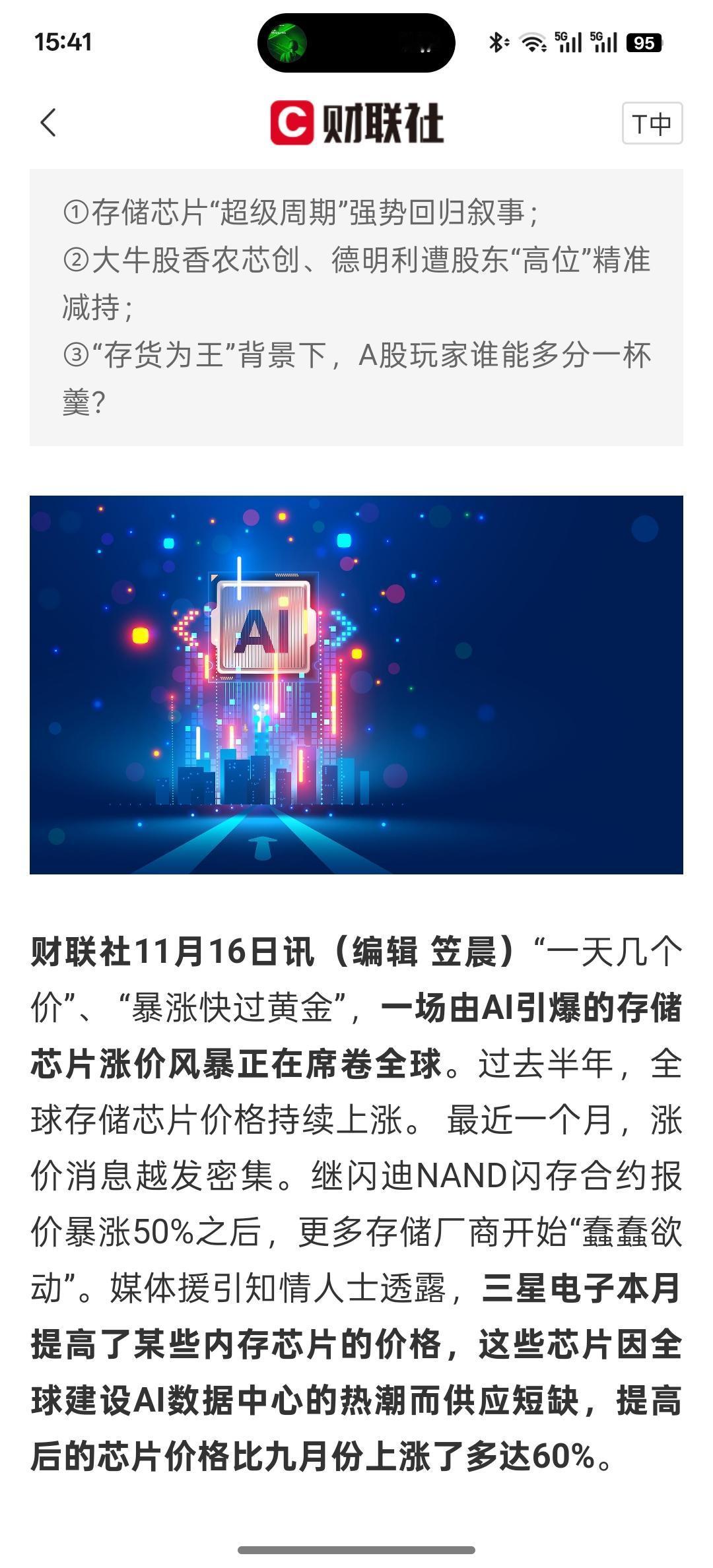 AI驱动掀起存储芯片“超级周期”:A股玩家谁能多分一杯羹?中国的人工智能超出了美国的想象!既然人工智能驱动芯片的价格上涨,国内也在加速芯片替代!最近,芯片行业发展确实得到了很多的订单!尤其是存储芯片,主要是算力中心跟数据中心的建设,需要大量的芯片来支撑!有韩国三星就开始涨价!涨幅达到60%,包括英伟达也去台积电,需要生产更多的芯片,支持英伟达!